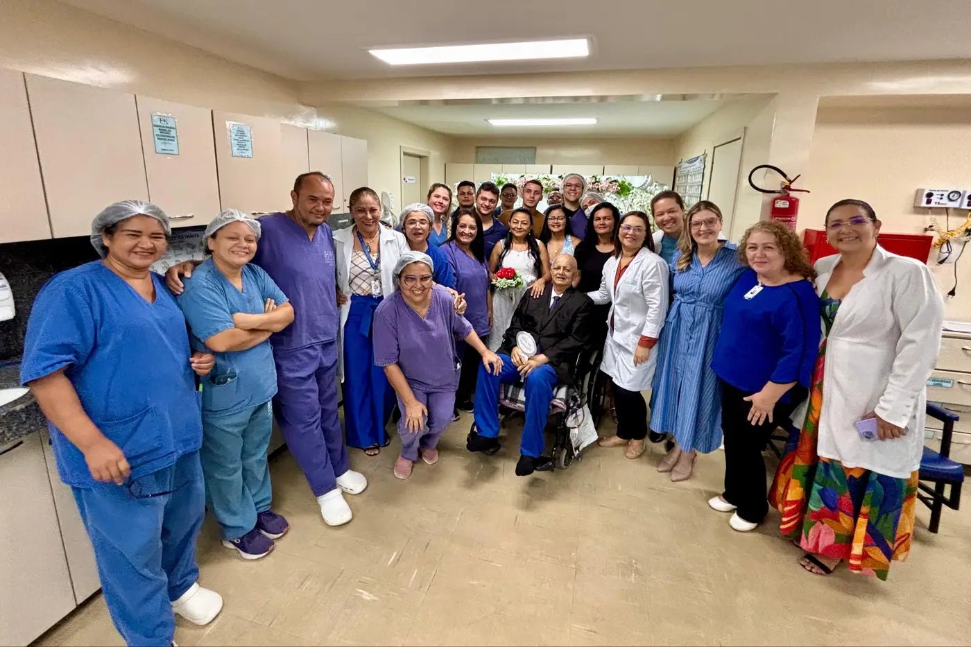 Diante da instabilidade clínica e impossibilidade de transferência para outra área do hospital, a equipe multiprofissional se mobilizou para montar um ambiente especial dentro da UTI, permitindo que o casal vivenciasse o sonho do casamento religioso, planejado há tantos anos.