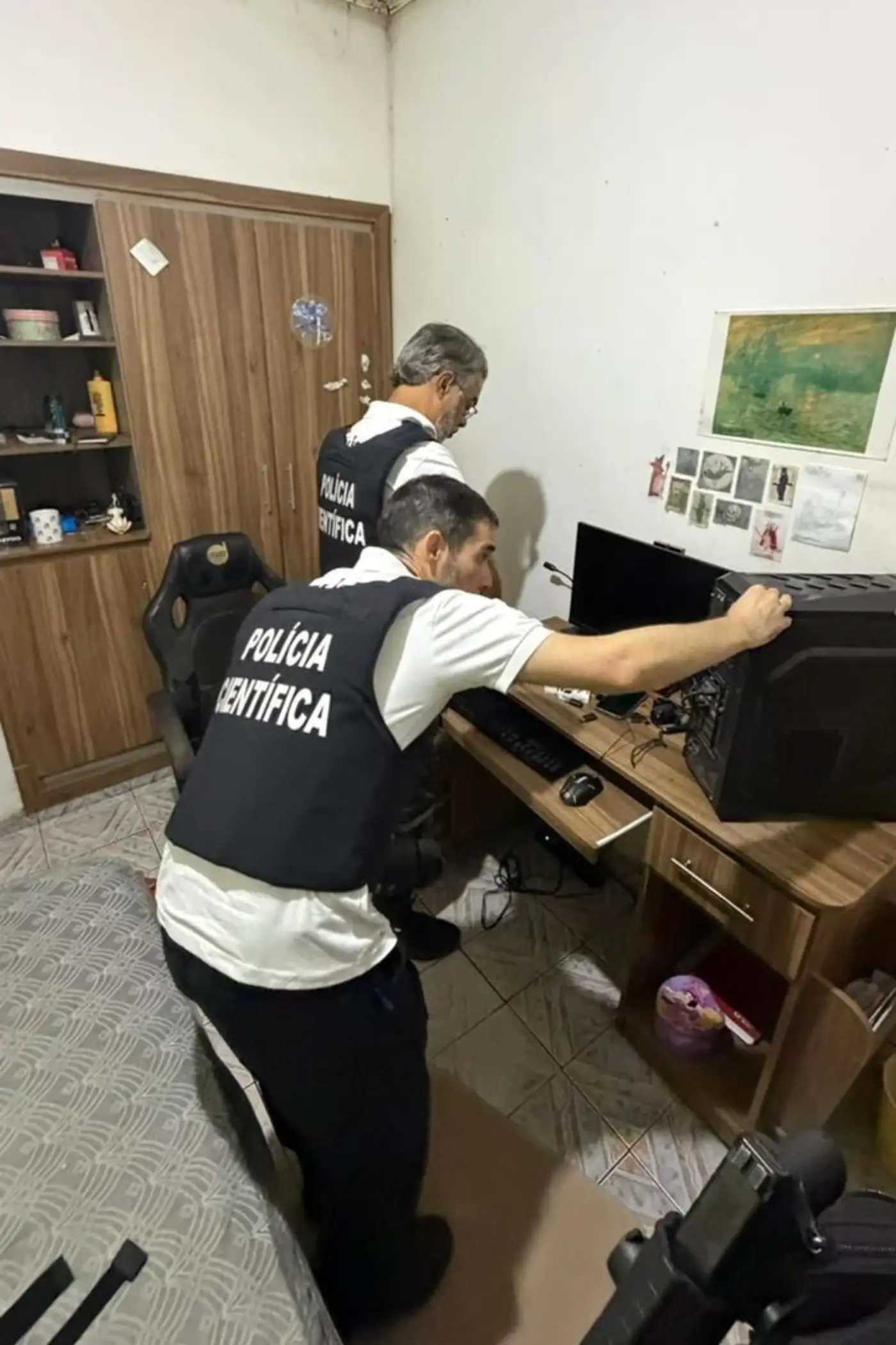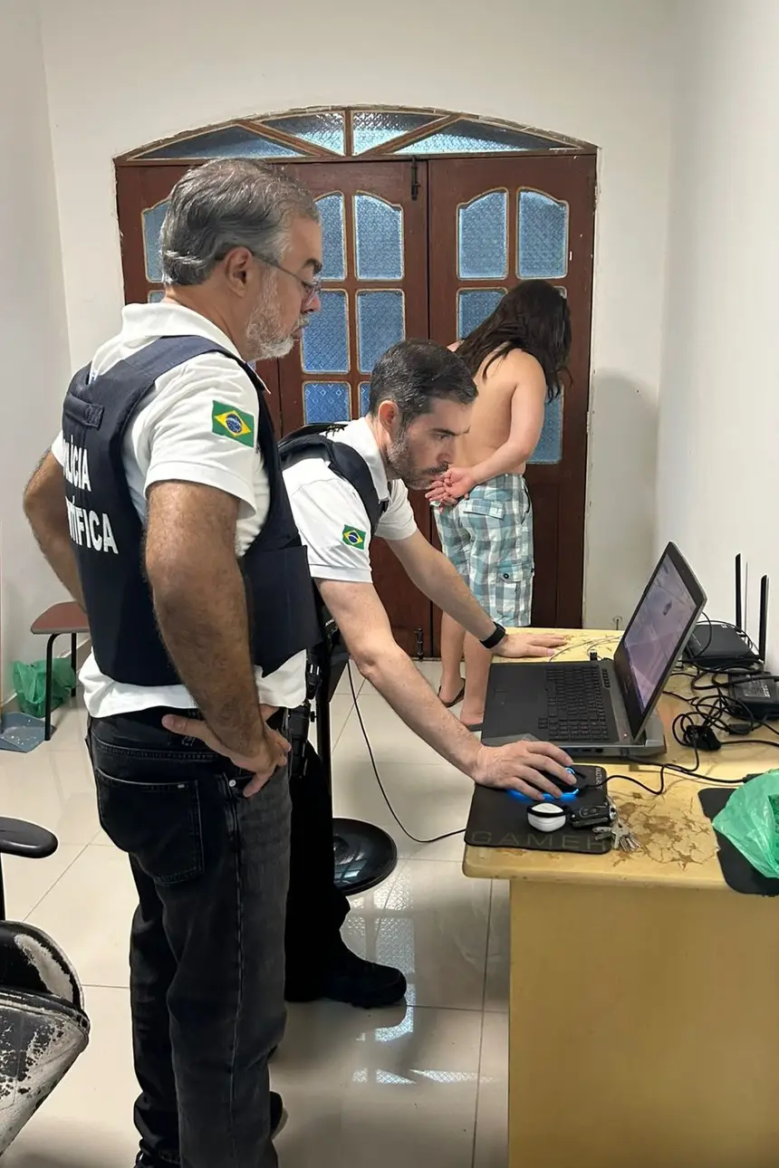 Durante a ação, foram cumpridos três mandados judiciais de busca e apreensão domiciliar no bairro de Fátima, em Belém, no contexto de investigação que apura o armazenamento de material de abuso sexual infantojuvenil em dispositivos eletrônicos.