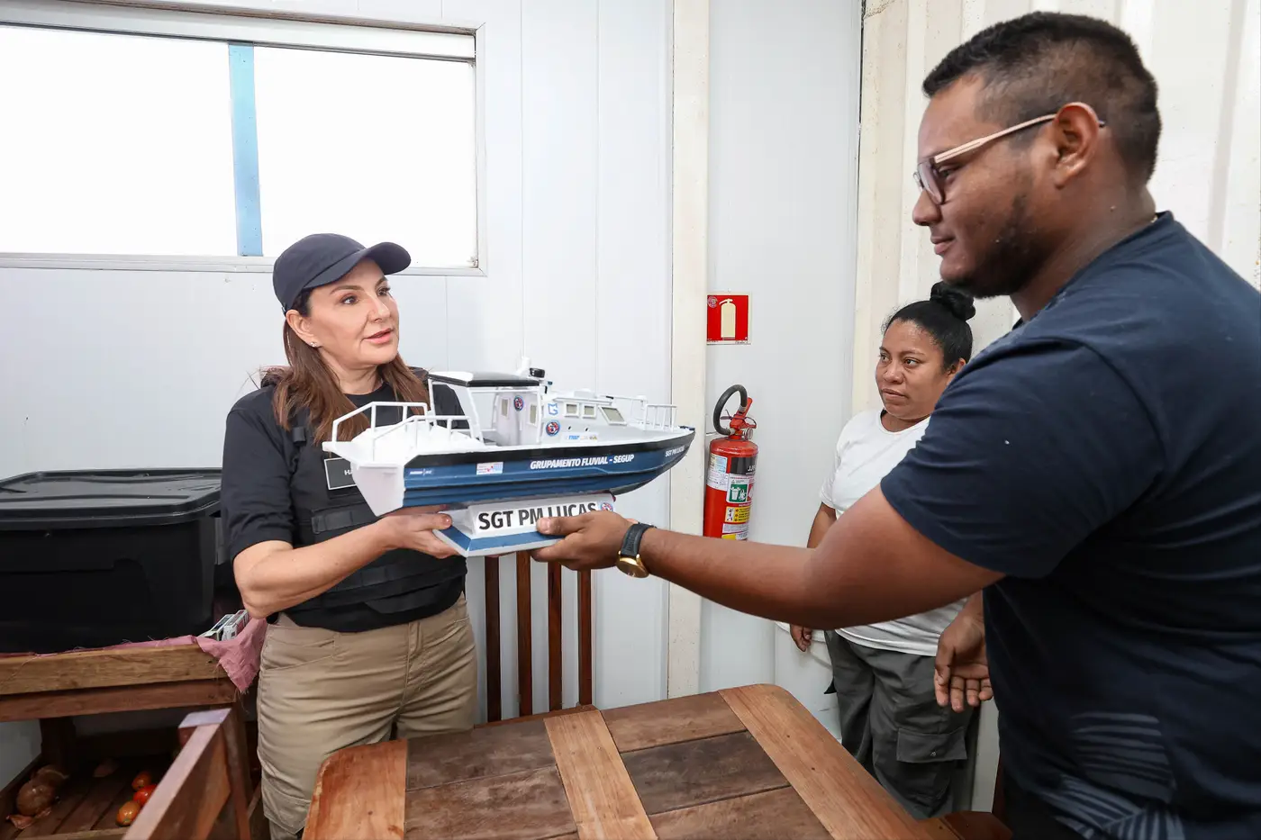 Durante a visita, a governadora percorreu as instalações da base, conhecendo os espaços utilizados pelas equipes operacionais e a estrutura disponível para o desenvolvimento das atividades na região. Na ocasião, Hana também recebeu de um morador uma réplica da lancha utilizada pelo Grupamento Fluvial (Gflu), gesto simbólico que demonstra o reconhecimento da população ao trabalho realizado pelas forças de segurança e a importância da estratégia de patrulhamento adotada na região.