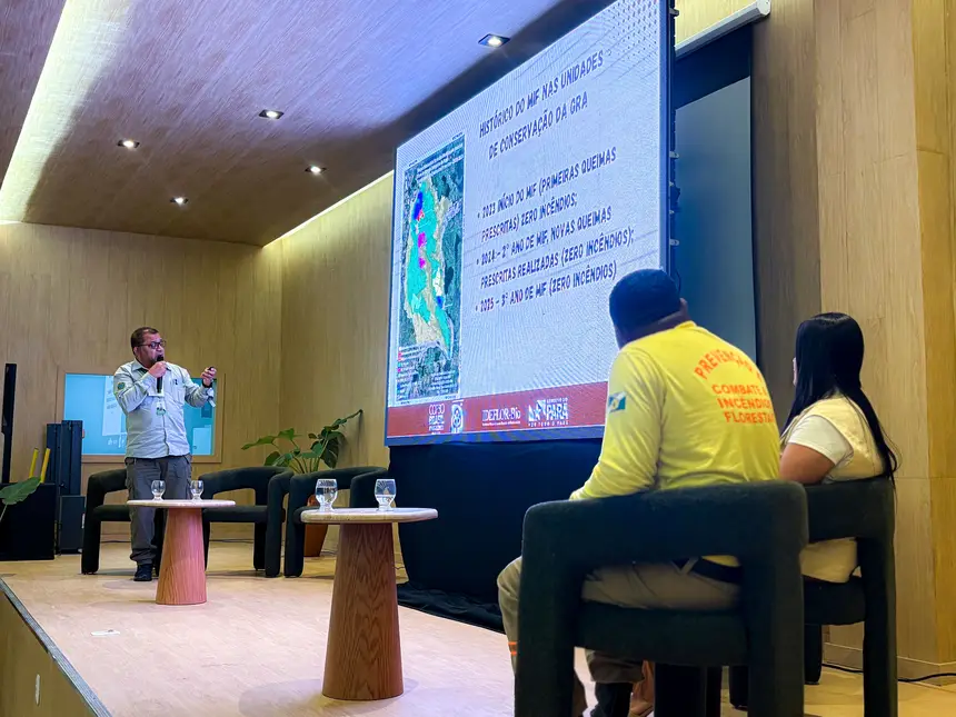 Governança ambiental - Ao final da manhã, uma palestra discutiu diversos temas relacionados à governança ambiental, incluindo o Programa de Manejo Integrado do Parque Estadual da Serra dos Martírios/Andorinhas, em São Geraldo do Araguaia, no sudeste paraense, que contribuiu para que a unidade de conservação do Ideflor-Bio não registrasse incêndios por três anos consecutivos.
