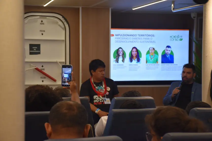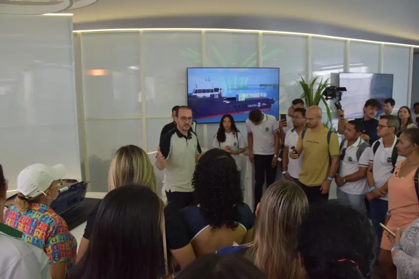 Os estudantes participaram de um circuito de visitação técnica para conhecer o funcionamento da embarcação e também acompanharam o painel “Impulsionando Territórios: parcerias e saberes para o desenvolvimento sustentável”, realizado pelo Instituto Mondó, que reuniu pesquisadores, gestores públicos e representantes de instituições comprometidas com a transição energética e a sustentabilidade na Amazônia.