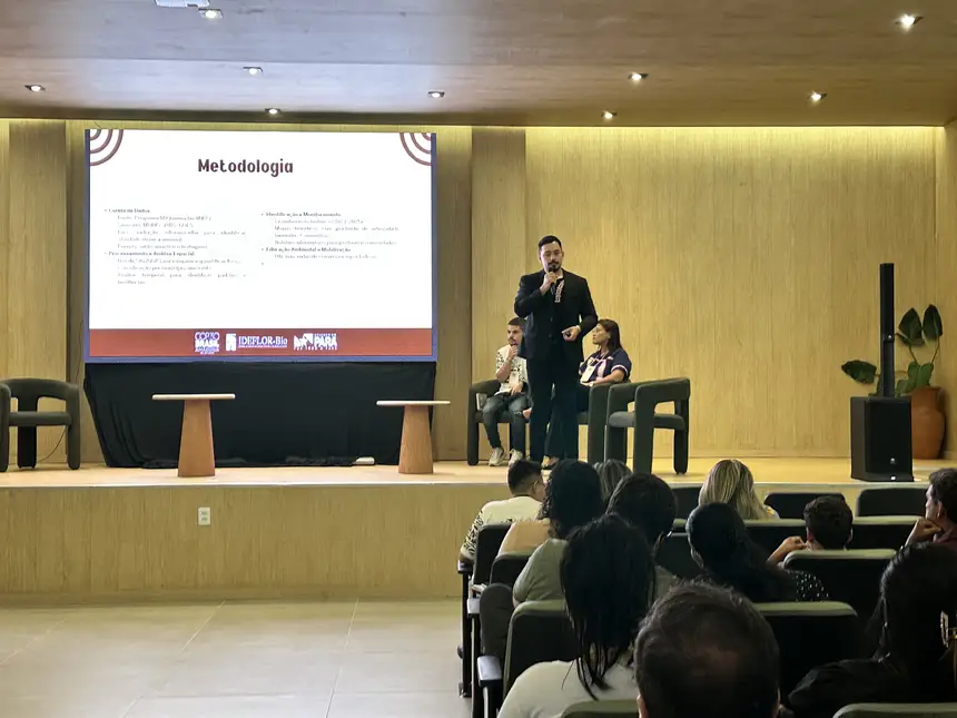 A manhã também reuniu experiências aplicadas no Arquipélago do Marajó, com o painel sobre educação ambiental e prevenção de queimadas do Projeto Verão, apresentado pelo gerente da Região Administrativa do Marajó do Ideflor-Bio, Hugo Deleon, juntamente com Nayana Silva e Matheus Cosme.
