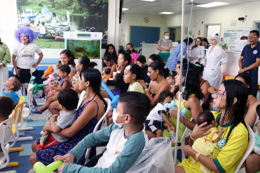 “Hoje foi um momento de celebrar o Dia das Crianças, por conta do mês de outubro que é um mês que desenvolvemos projetos relacionados às crianças. É um momento de celebrar com elas através de atividades lúdicas, de brincadeiras, com a presença de palhaços, de bonecas, envolvendo as crianças para celebrar o Dia delas. Além disso, contamos também com a distribuição de mais de 60 presentes para todas as nossas crianças que estão internadas na unidade de pediatria”. Pontua Rosilene.