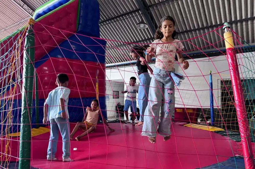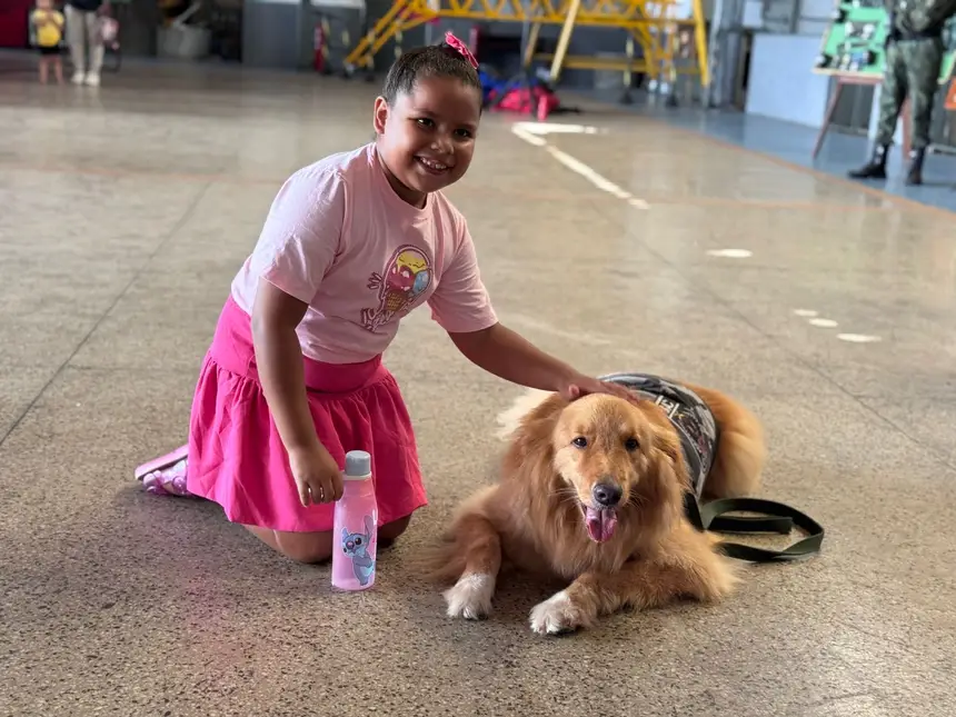 Mariana, de oito anos, teve essa chance proporcionada pela Usina da Paz da Terra-Firme e se divertiu com as brincadeiras, e também com a cadela Mel do Batalhão de Ações com Cães (BAC) da Polícia Militar que encheu de fofura a manhã das crianças.
