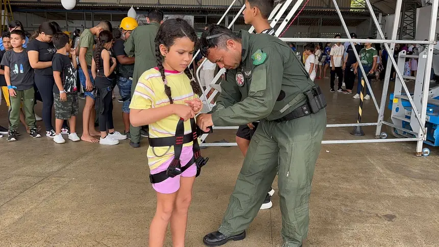 Programação na manhã deste sábado (4) ofereceu atividades como a tirolesa, exposição de animais e apresentou as aeronaves e ações de unidades policiais
