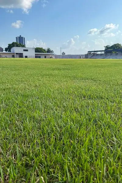 A grama Esmeralda foi escolhida por sua resistência ao pisoteio intenso, rápida recuperação e adaptação ao clima amazônico, mantendo o campo verde, uniforme e com excelente qualidade estética ao longo do ano.