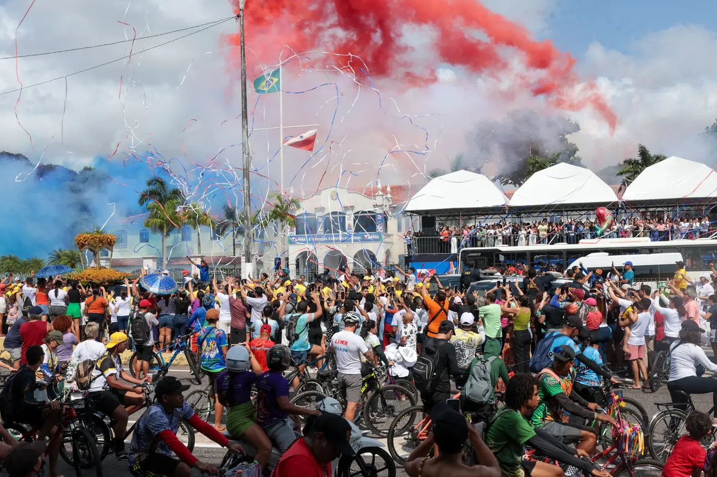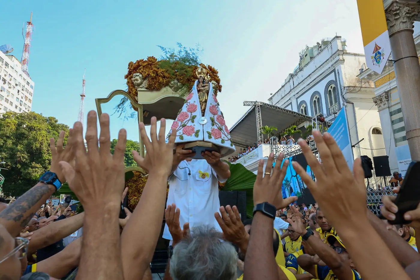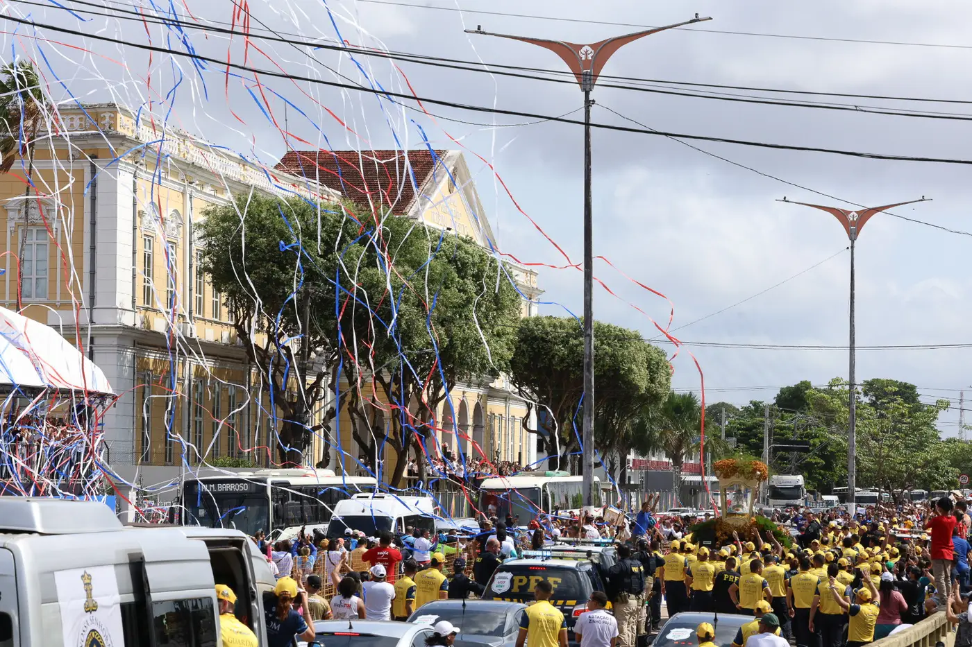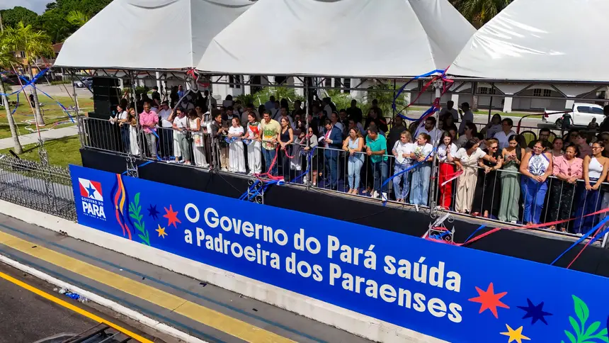 Em frente ao Palácio do Governo, onde o governador Helder Barbalho e a vice-governadora Hana Ghassan acompanhavam o traslado. Houve inclusive a homenagem com chuva de papel picado e fogos de baixo ruído. A berlinda ficou parada por cerca de 40 segundos, tempo em que as orações foram feitas de forma silenciosa.
