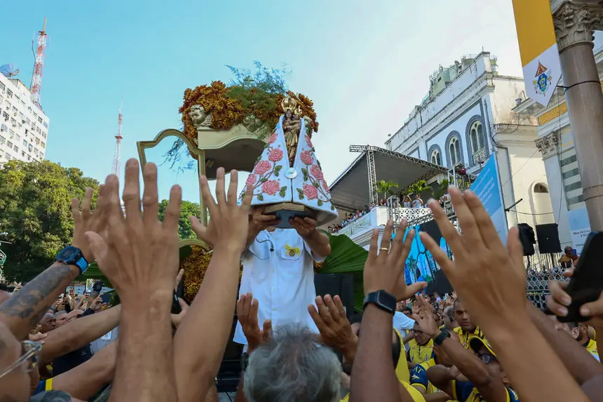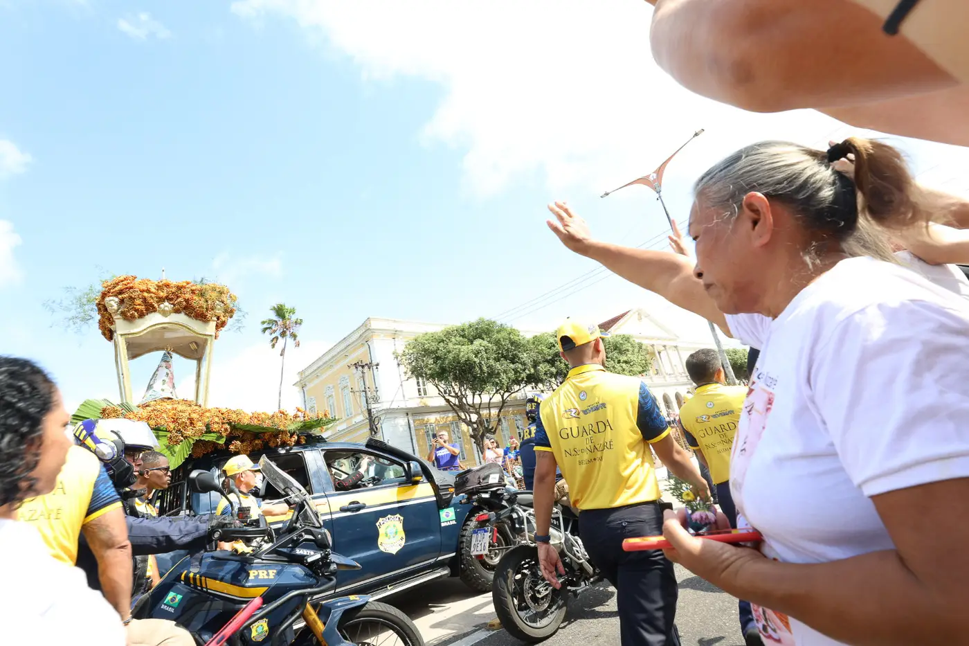 O carro com a berlinda é acompanhado por ciclistas, corredores e outros veículos. As calçadas e canteiros centrais ficam lotados de fiéis que aguardam para assistir a passagem da padroeira.