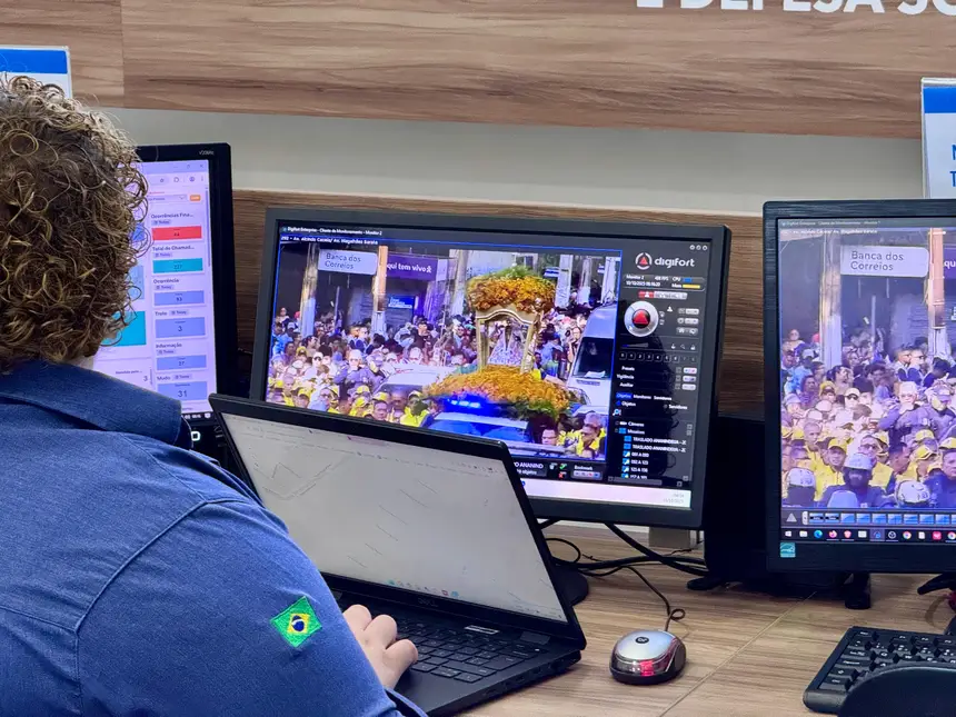 CICC e monitoramento - Do Centro Integrado de Comando e Controle é possível acompanhar todas as 49 homenagens previstas ao longo do percurso. Através do mosaico de câmeras do videomonitoramento do Centro Integrado de Operações, o Ciop, os agentes acompanham o desenvolvimento da romaria até a chegada, na Igreja Matriz de Ananindeua.