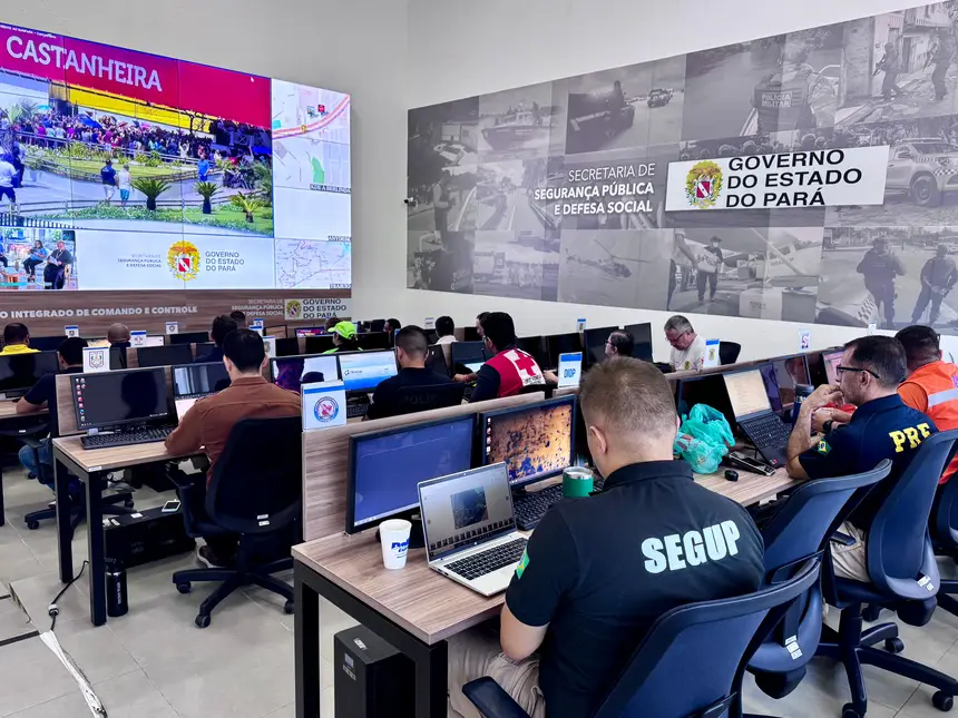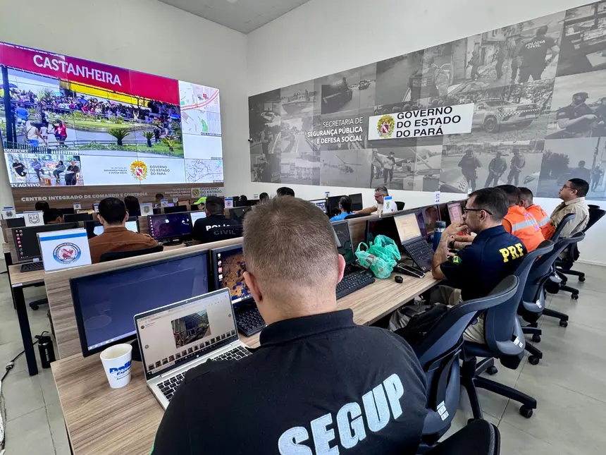 Agentes integrados das forças de segurança do Estado estão reunidos no Centro Integrado de Comando e Controle Estadual, o CICC, localizado na sede da Secretaria de Segurança Pública e Defesa Social (Segup), monitorando o trajeto de 50 quilômetros, percorrido pela berlinda de Nossa Senhora de Nazaré no Traslado, iniciado nesta sexta-feira, 10. A procissão rodoviária saiu da Basílica de Nazaré, em Belém, e seguiu para Marituba e Ananindeua. As ações de segurança coordenadas pela Segup contam com mais de 12 mil agentes envolvidos no esquema planejado para a Festividade de Nazaré 2025.
