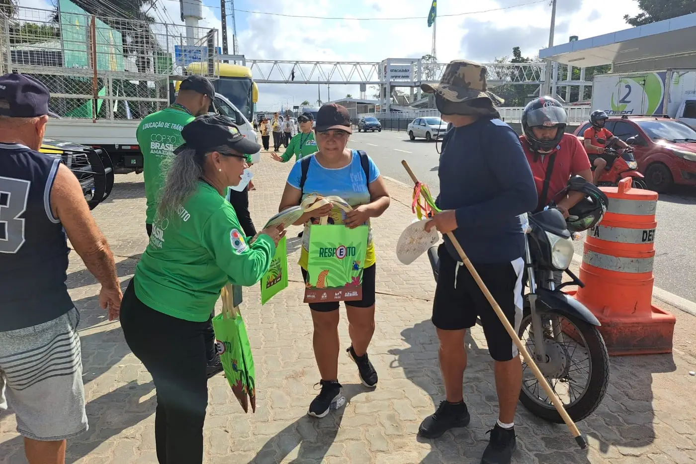 Com foco nos promesseiros que caminham pela rodovia até a Basílica Santuário, os agentes abordaram quem passava pelo local, acolhendo e explicando sobre como transitar em segurança. "Estamos explicado sobre como eles podem finalizar a caminhada sem correr risco, transitando exclusivamente pelas calçadas, sem acessar as pistas principais da rodovia e respeitando a sinalização. Estamos fazendo a acolhida também, distribuindo a sacola ecológica, o lixocar, para que eles tenham essa consciência ambiental ao chegar para o Círio", explica a coordenadora de educação, Celina Koury.