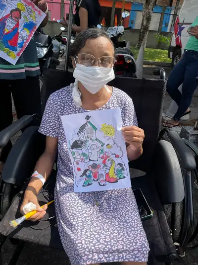 A psicóloga Elizabeth Silva e a fisioterapeuta Carla Brabo lideraram as atividades destinadas aos pacientes e acompanhantes, empregando a arteterapia como meio de expressão e acolhimento. Sob a supervisão da psicóloga Elizabeth Silva, os pacientes participaram de uma atividade de pintura livre, na qual puderam colocar na tela branca tudo o que lhes proporcionasse conforto e bem-estar.