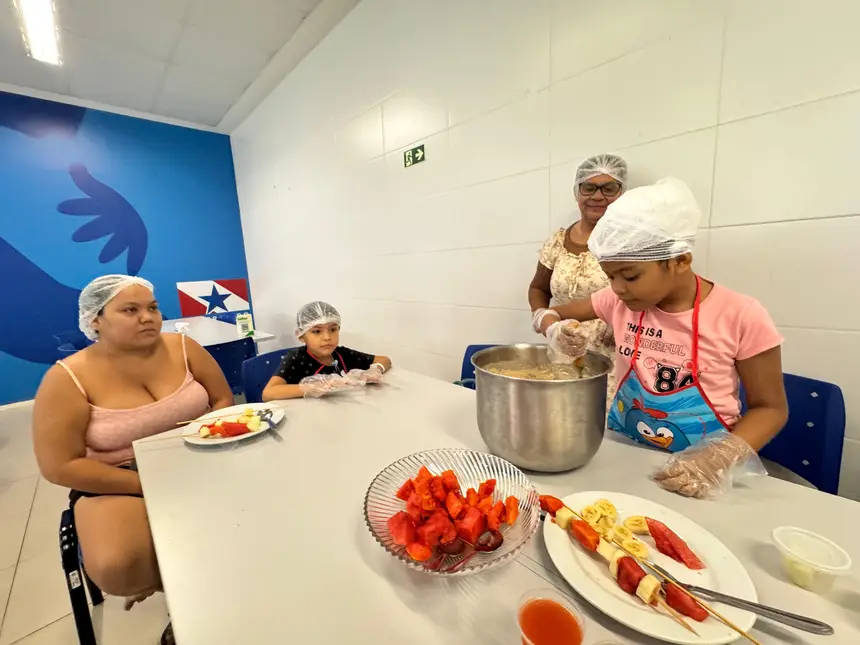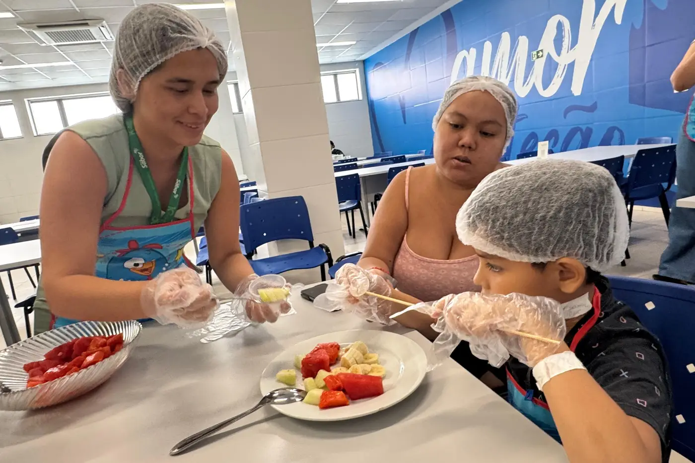 No cardápio, espetinho, salada de frutas e bolo de cenoura com calda de chocolate 75% cacau foram preparados pelas crianças liberadas para participar da oficina.