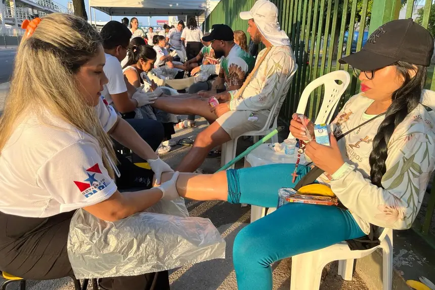 No trajeto de cerca de 300 quilômetros a pé de Cametá, no nordeste paraense, até Belém, o promesseiro Arodinaldo Gaia de Souza, conhecido como "Professor Arogas”, 59 anos, ganhou o cuidado oferecido pelo Hospital Metropolitano de Urgência e Emergência (HMUE), nesta sexta-feira (10). Ele esteve entre as 344 pessoas atendidas no Ponto de Acolhimento Assistencial e de Humanização do HMUE, que há 14 anos garantem apoio aos promesseiros.