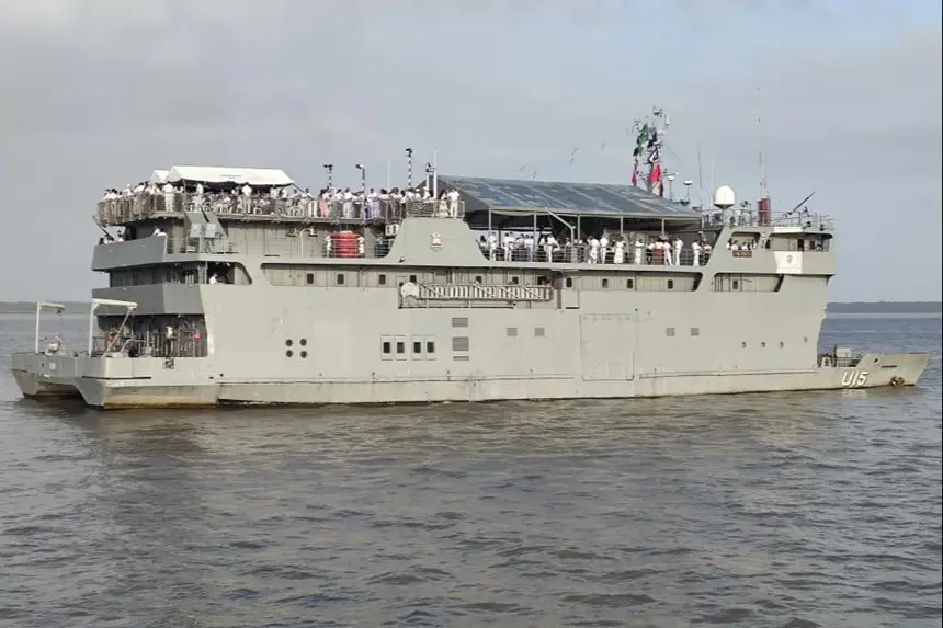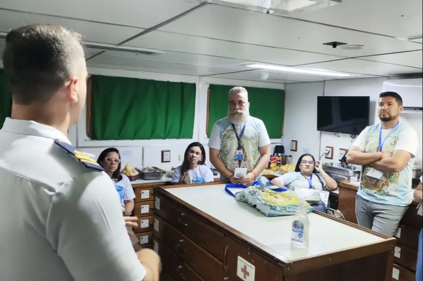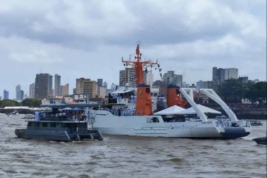 O navio Garnier Sampaio, da Marinha do Brasil, conduziu a imagem peregrina de Nossa Senhora de Nazaré pelas águas da Baía do Guajará, em um percurso de cerca de 18 quilômetros – aproximadamente 10 milhas náuticas – que ligou o novo Terminal Hidroviário Turístico de Icoaraci à Escadinha da Estação das Docas, em Belém.