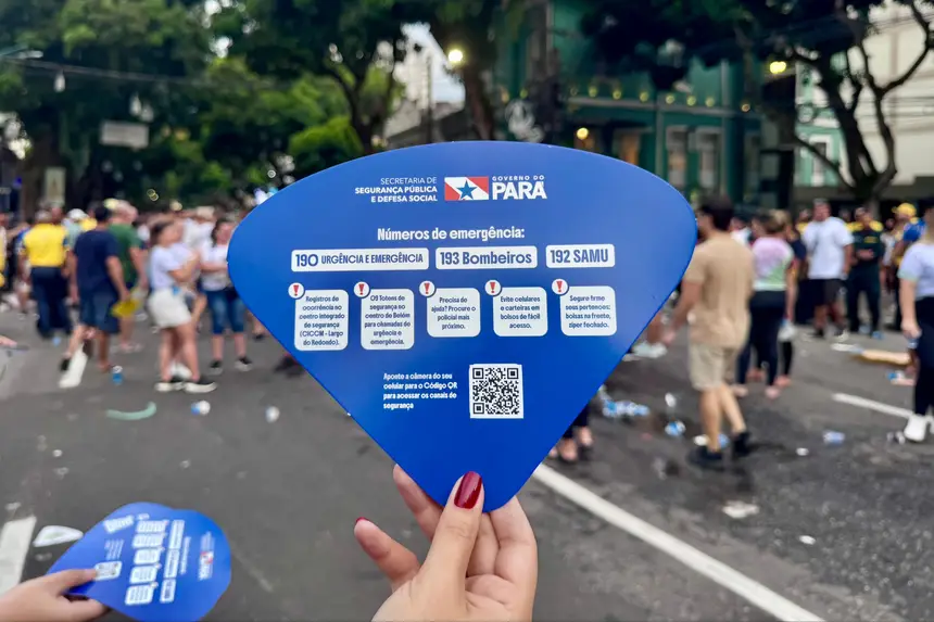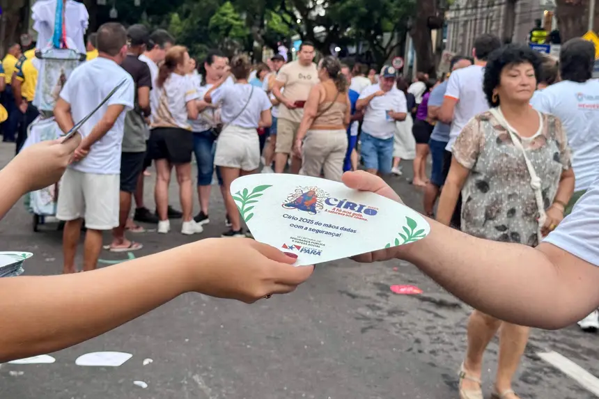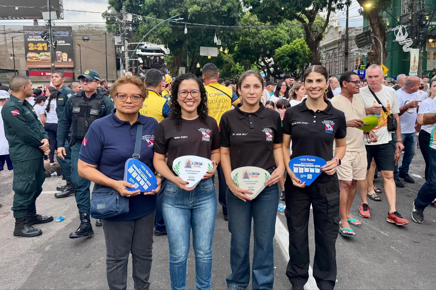 Durante as ações de segurança na trasladação, uma equipe da Diretoria de Políticas Públicas e Prevenção Social (DPS) da Segup realizou uma ação com a entrega de ventarolas aos romeiros, reforçando os canais oficiais de denúncia e dicas de segurança para aqueles que caminhavam no trajeto da procissão.