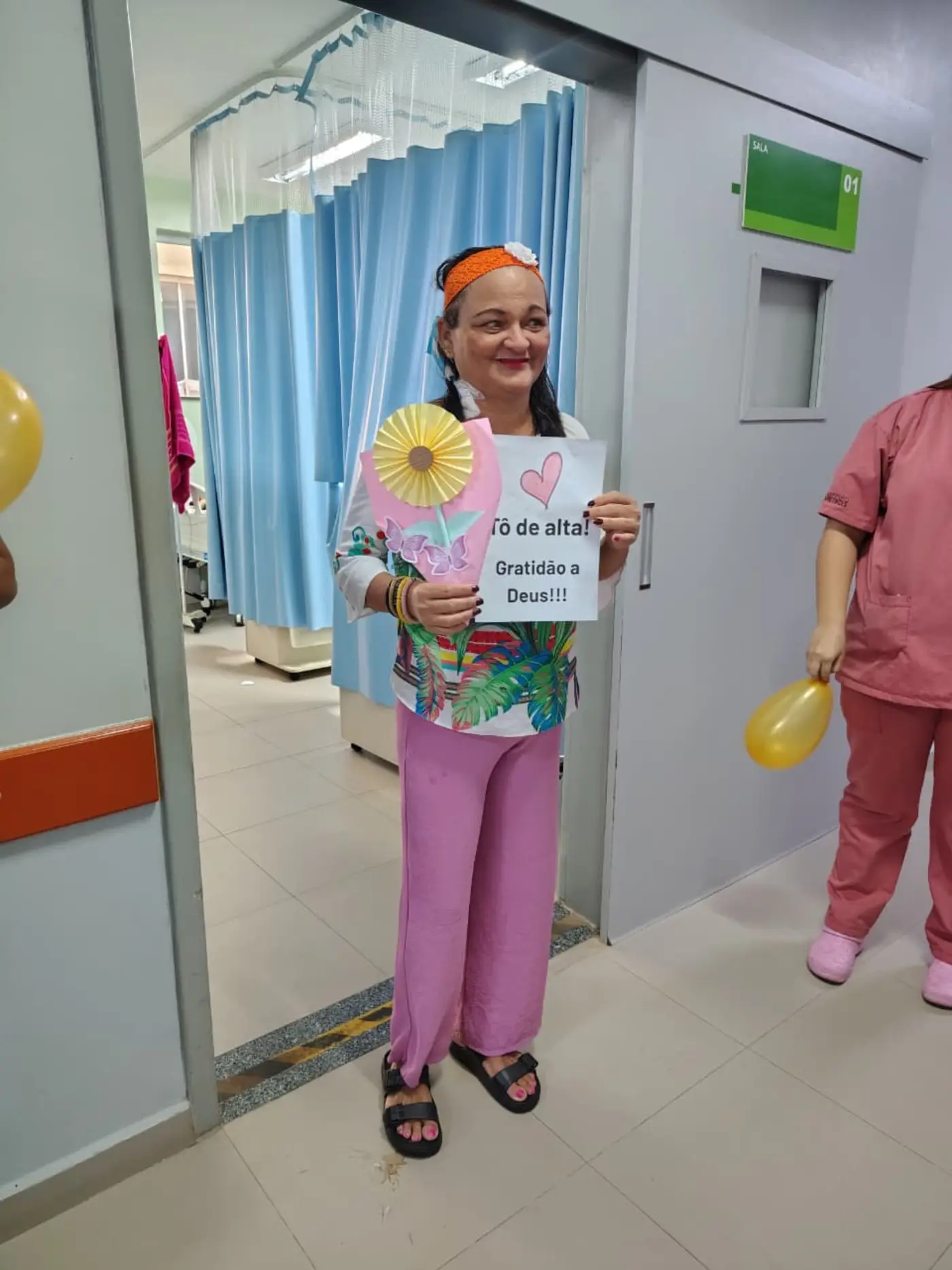 Como parte da homenagem, a paciente recebeu um buquê de girassóis feitos à mão, representando esperança, luz e o recomeço de uma nova etapa. A celebração teve início na enfermaria, local onde esteve internada, e foi marcada pela gratidão de toda a equipe pela trajetória de superação vivida ao longo dos quatro meses de tratamento.