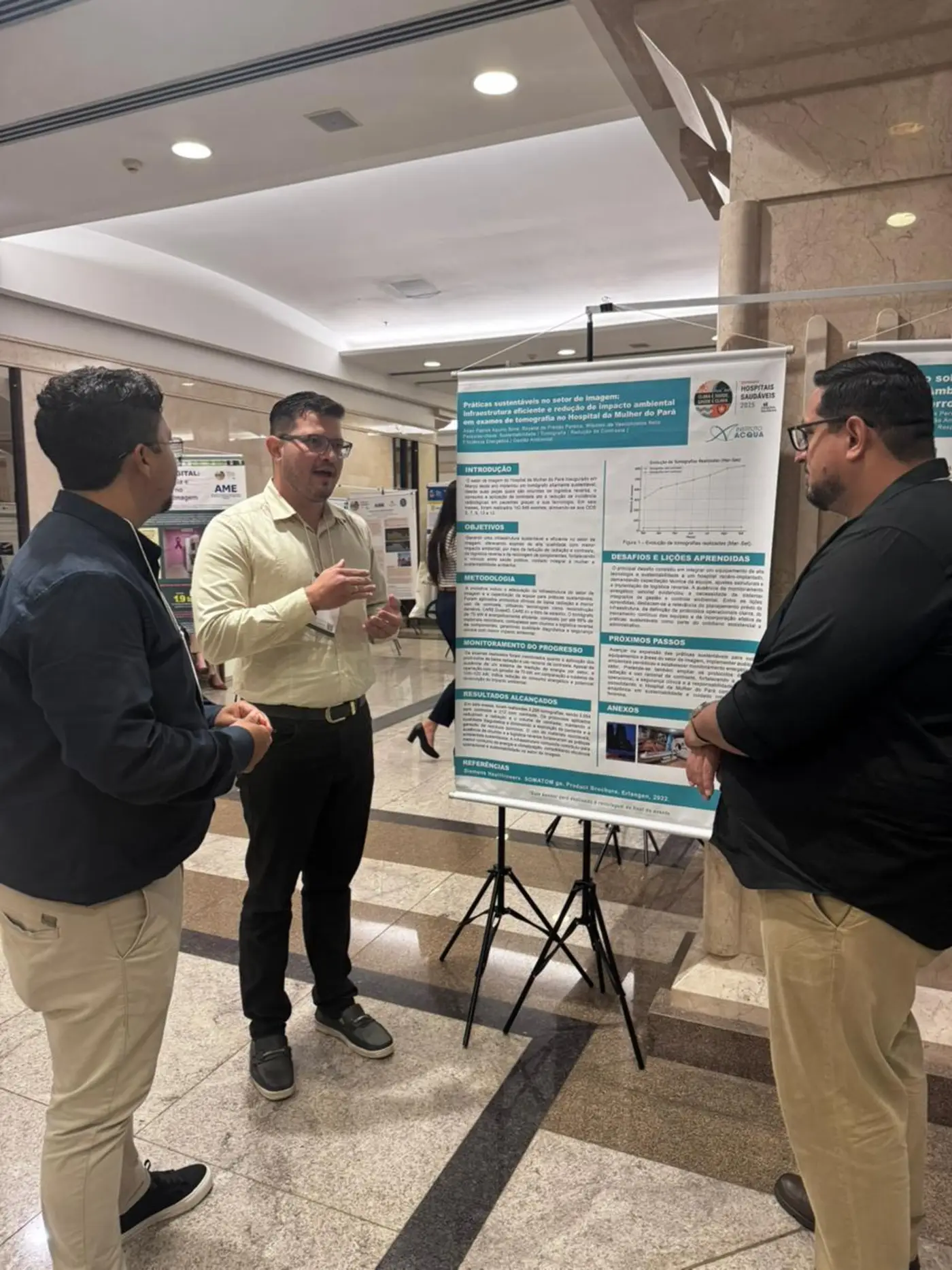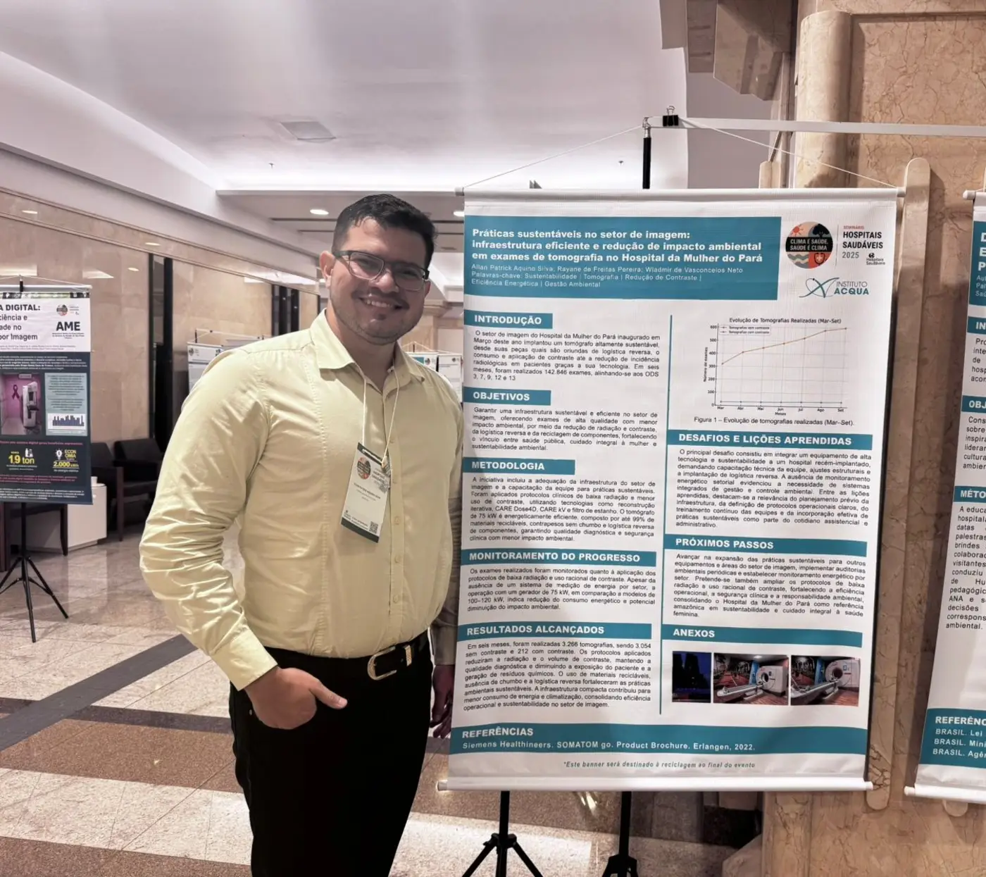 O Seminário que trouxe como tema deste ano “Clima é Saúde, Saúde é Clima”, abrangeu a exposição de trabalhos desenvolvidos por instituições de todo o país e o Hospital da Mulher do Pará foi representado pelo artigo intitulado "Práticas sustentáveis no setor de imagem: infraestrutura eficiente e redução de impacto ambiental em exames de tomografia no Hospital da Mulher do Pará", compartilhado aos participantes do evento pelo supervisor operacional do HMPA, Allan Aquino. O trabalho foi selecionado para apresentação na modalidade "Experiência Profissional" e exposto em formato de pôster.