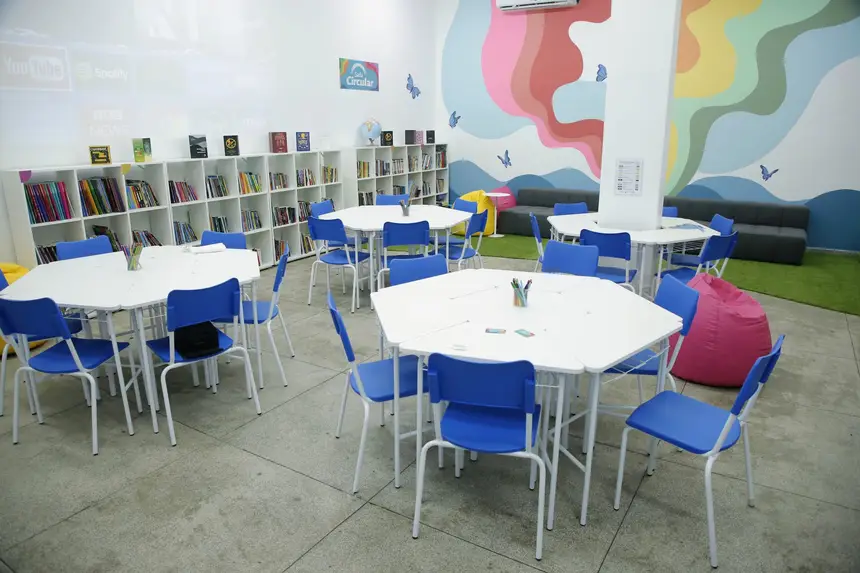 Literatura e tour virtual - A Sala Circular é um ambiente interativo, que estimula o conhecimento por meio da leitura e tecnologia. O espaço conta com cinema, área maker, óculos de realidade virtual (3D) e 1.200 livros, além de ferramentas digitais que permitem experiências imersivas, como um tour virtual pelo mundo com conteúdos sobre sustentabilidade, biomas e práticas ambientais.