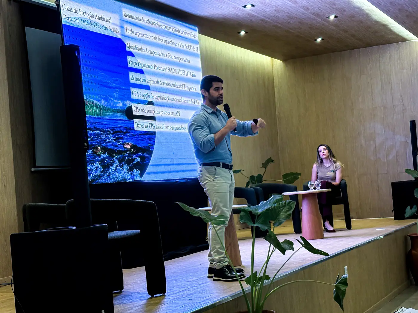 Cota de Proteção Ambiental - A primeira palestra do dia, sobre Cotas de Proteção Ambiental (CPA), abordou a importância do projeto para regularização de imóveis rurais com passivos de reserva legal consolidados até julho de 2008. O palestrante do painel e assessor técnico do Ideflor-Bio, Thiago Valente, ressaltou que a ação é importante para mostrar ao mundo as atividades e ações ambientais do órgão.