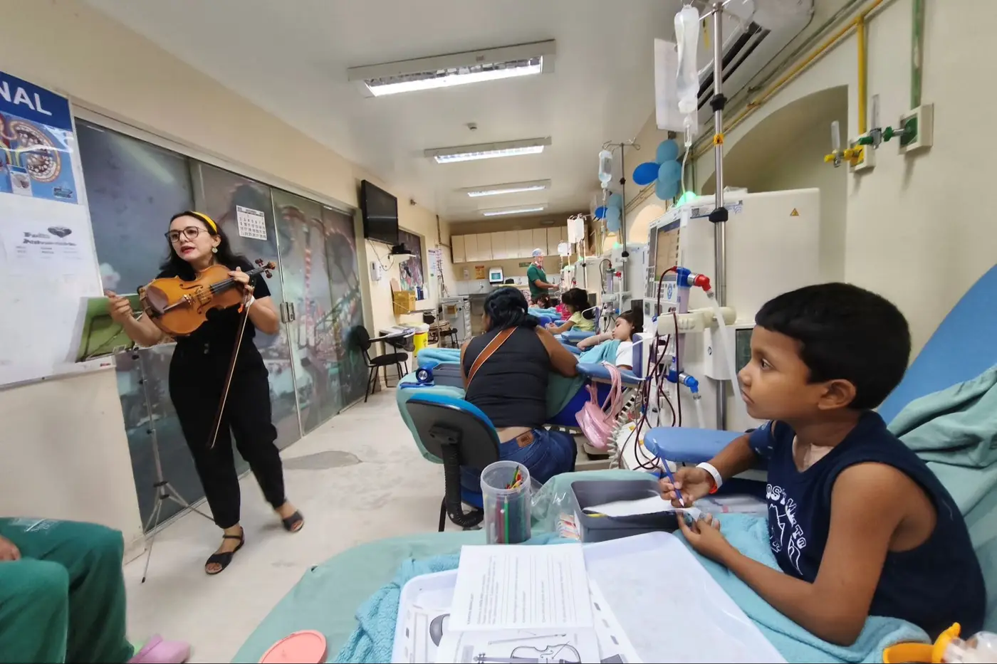 A iniciativa foi de Rafaele Cordeiro, mãe de Clarisse, de sete anos, que há dois anos faz hemodiálise na Santa Casa. Como professora de violino e concluinte do curso de licenciatura em música, ela precisava desenvolver um projeto acadêmico sobre educação de qualidade e resolveu se desafiar dando uma aula de música para as crianças durante a realização da sessão de hemodiálise.