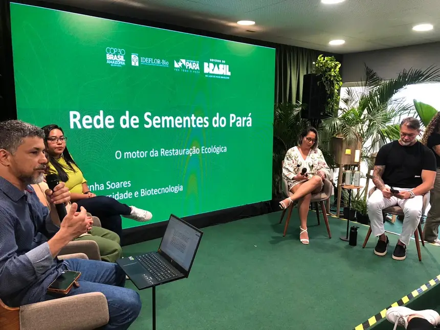Com o tema: “Rede de Sementes e Mudas do Pará: Inclusão Produtiva e Restauração para uma Economia da Floresta em Pé”, foi apresentado dentro da programação do Pavilhão Pará na Conferência das Nações Unidas sobre Mudanças Climáticas, a COP 30, nesta quarta-feira (12) os projetos Sistemas Agroflorestais (PROSAF) e Rede de Sementes do Estado do Pará, desenvolvidos pelo Instituto de Desenvolvimento Florestal e da Biodiversidade do Pará (Ideflor-Bio).