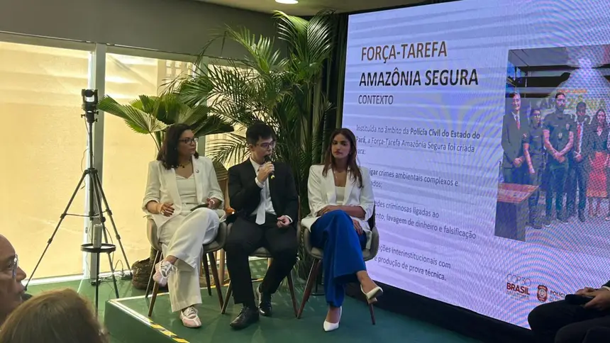 Atuação contínua - Os participantes do painel incluíram o delegado Iuri Castro e o investigador Sandrison Ribeiro, que abordaram a Força-tarefa Amazônia Segura, vinculada à “Operação Curupira”, voltada para o combate e desarticulação de crimes ambientais como desmatamento e garimpo ilegal na região amazônica. O momento também abordou o êxito da operação “Triunfo da Amazônia”, deflagrada em 2023, que prendeu um homem apontado como o maior devastador da Área de Proteção Ambiental (APA) Triunfo do Xingu, situada no município de São Félix do Xingu.