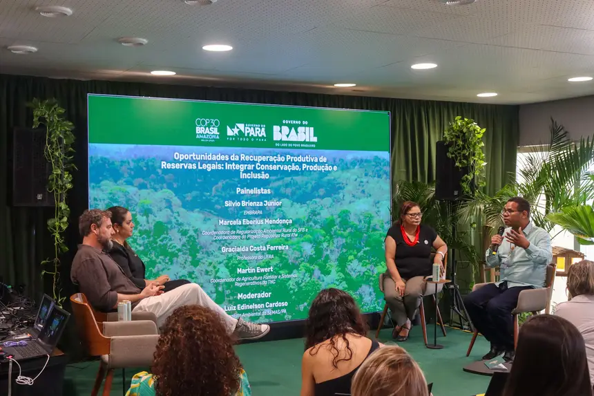 O painel “Oportunidades da Recuperação Produtiva de Reservas Legais: integrar conservação, produção e inclusão”, realizado na sexta-feira (14), na Sala Castanheira do Pavilhão Pará na COP30, reuniu especialistas, produtores e representantes de instituições públicas e privadas. A discussão apontou caminhos para transformar áreas degradadas em sistemas produtivos diversificados, ampliando renda, fortalecendo a agricultura familiar e recuperando a floresta.