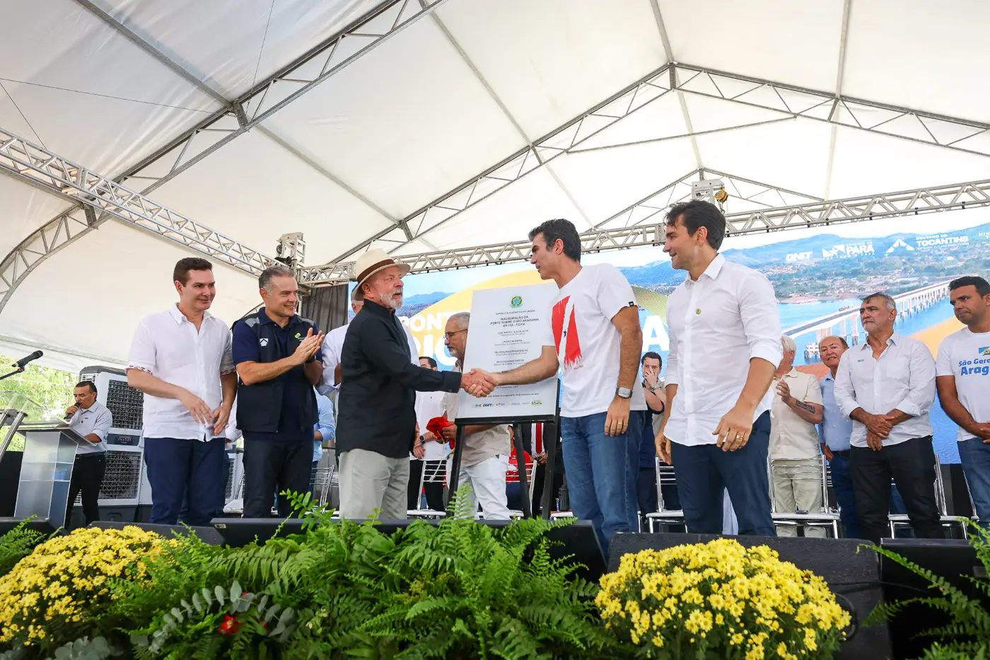 O governador Helder Barbalho participou, na manhã desta terça-feira (18), ao lado do presidente Luiz Inácio Lula da Silva, da entrega da nova ponte sobre o Rio Araguaia, que conecta as cidades de São Geraldo do Araguaia, no Pará, e Xambioá, no Tocantins, pela BR-153. A obra, executada pelo Governo Federal, possui 2.010 metros de extensão, sendo 310 metros no território paraense e 1.700 metros no tocantinense.