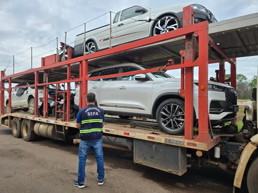“Um caminhão cegonha oriundo de Mato Grosso transportava veículos. Foram apresentados os documentos fiscais, entre eles três notas referentes a três motocicletas novas e um veículo, também novo, todos destinados a pessoas físicas. O Conhecimento de Transporte Eletrônico informava como destino o Estado do Pará, no município de Itaituba. No entanto, as notas fiscais, tanto do veículo quanto das motocicletas, tinham como destino cidades do Estado do Mato Grosso. Ao realizarmos o cruzamento de informações foi verificado que o destinatário de duas motocicletas é inscrito no cadastro de contribuintes do Pará, tendo como atividade principal o comércio varejista de motocicletas e motonetas”, relatou o coordenador da unidade, Maycon Freitas.