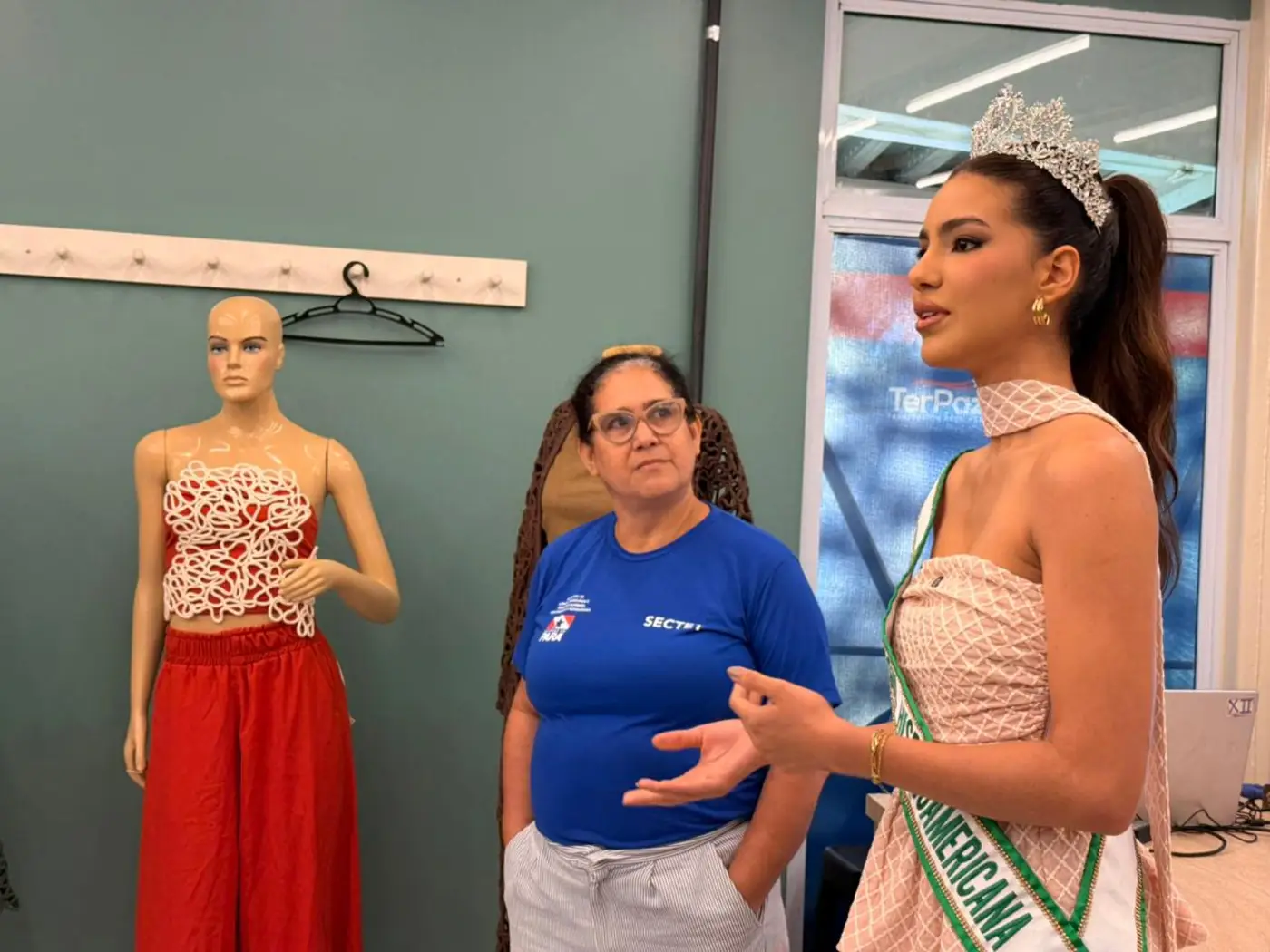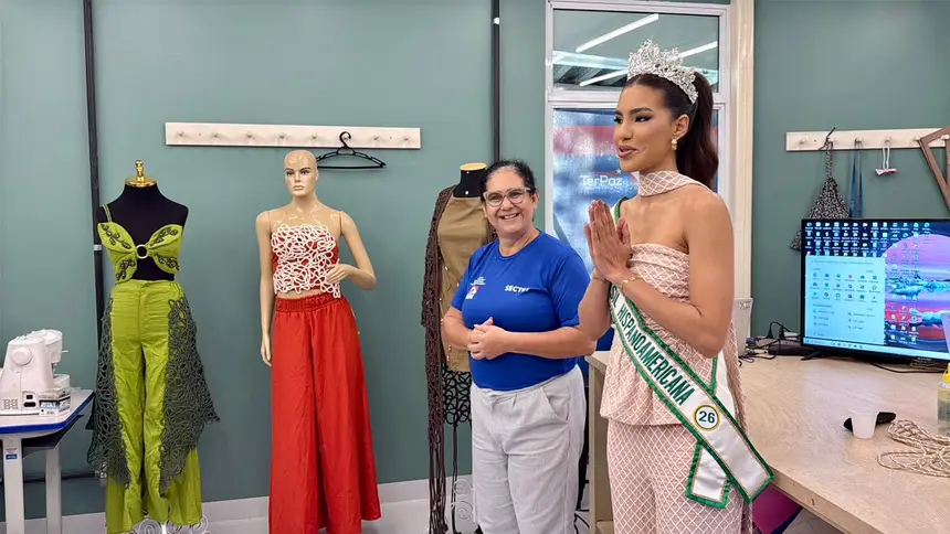 A Miss visitou a Usina da Paz nesta sexta-feira (28) para conhecer de perto o trabalho das estudantes, acompanhar a rotina da sala de costura e gravar vídeos institucionais que serão exibidos durante sua participação no concurso, destacando o impacto social do projeto.