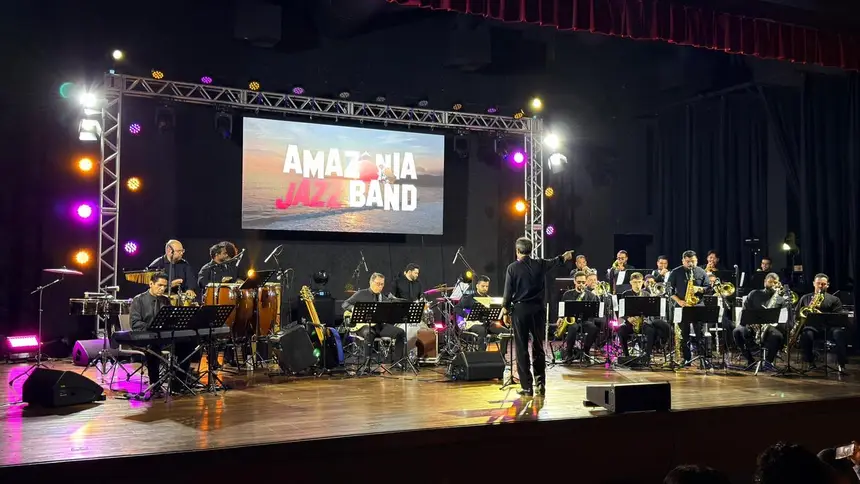 A Amazônia Jazz Band apresentou o espetáculo “Festa Amazônica”, na noite desta quinta-feira, 4, no Teatro do Liceu da Música, em Bragança, no nordeste paraense, sob a regência do maestro Eduardo Lima, com duas sessões esgotadas.