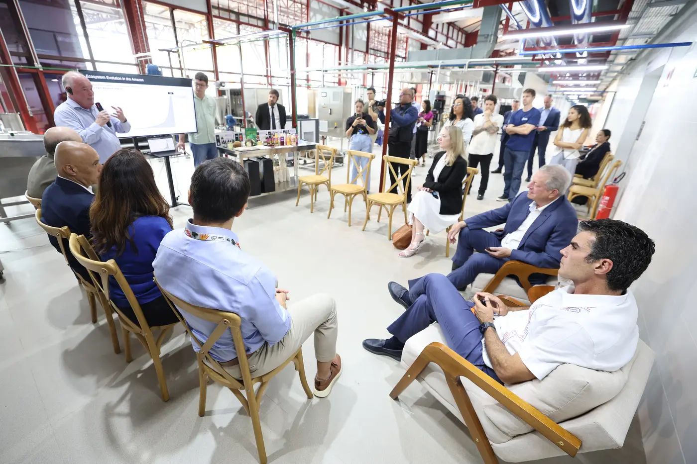 Durante as visitas, as comitivas conheceram o laboratório-fábrica, instalado no Armazém 6, considerado o epicentro da transformação tecnológica do Parque. O espaço é equipado para pesquisa e desenvolvimento, prototipagem, processamento, experimentação e produção experimental de alimentos, cosméticos e químicos finos a partir de insumos florestais.