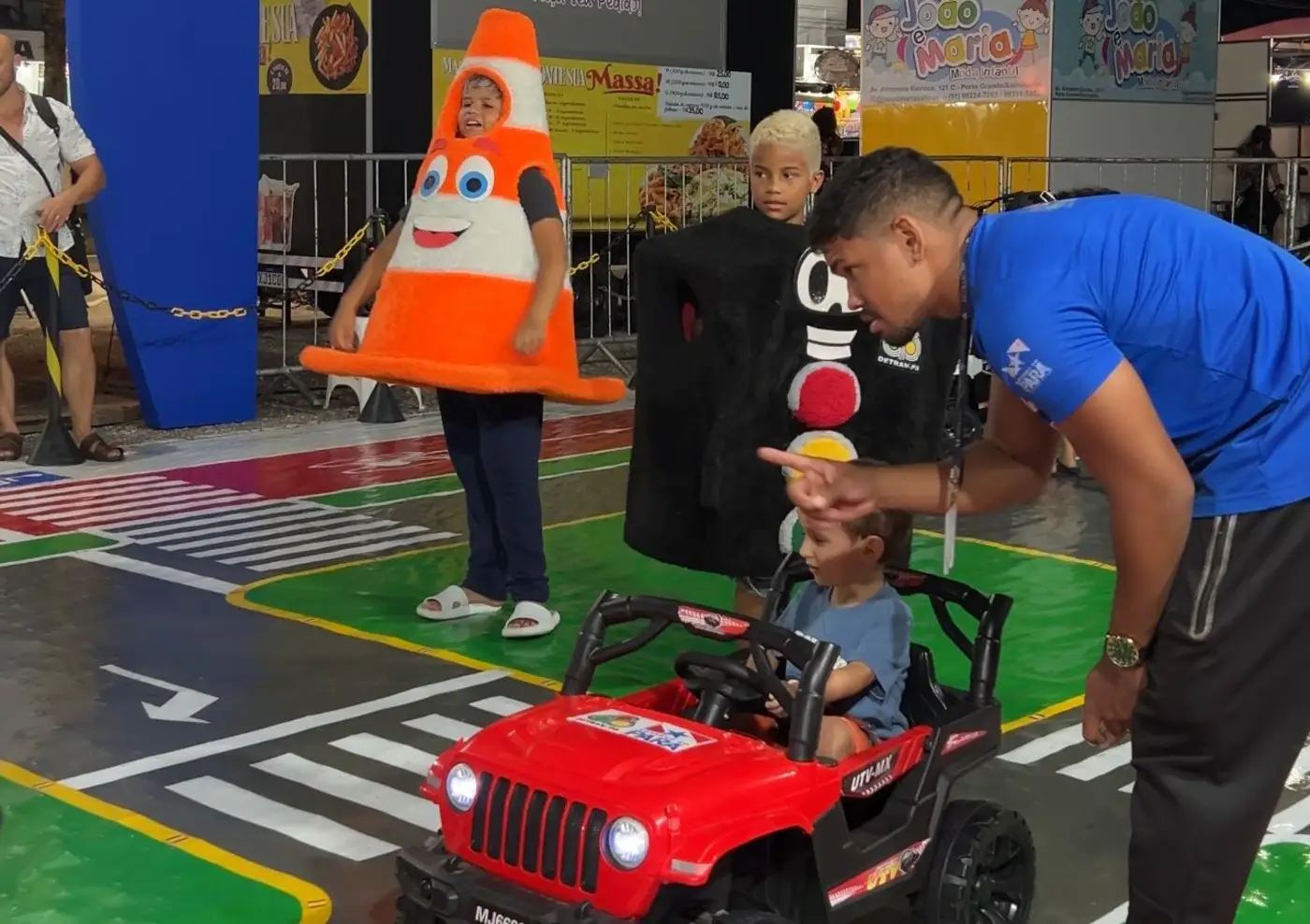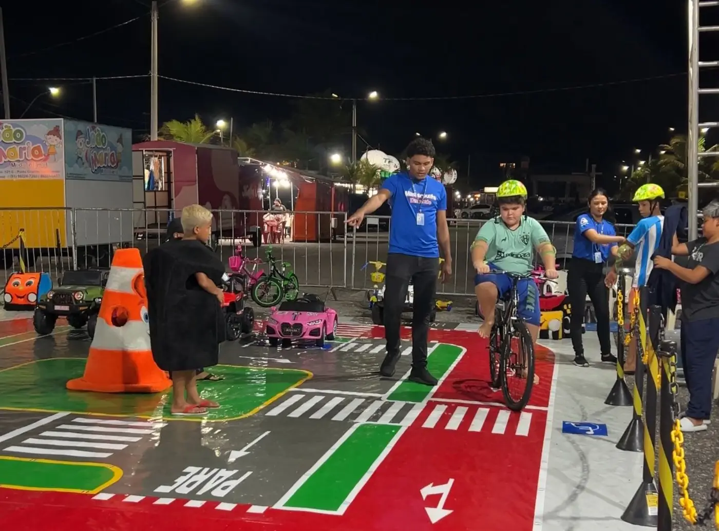 Durante a noite, as ações educativas do Detran ganham um caráter lúdico e pedagógico, voltado especialmente ao público infantil, por meio do Minicircuito Itinerante. A iniciativa tem como objetivo ensinar, de forma prática e acessível, as regras básicas de um trânsito seguro, estimulando desde cedo comportamentos responsáveis e conscientes.