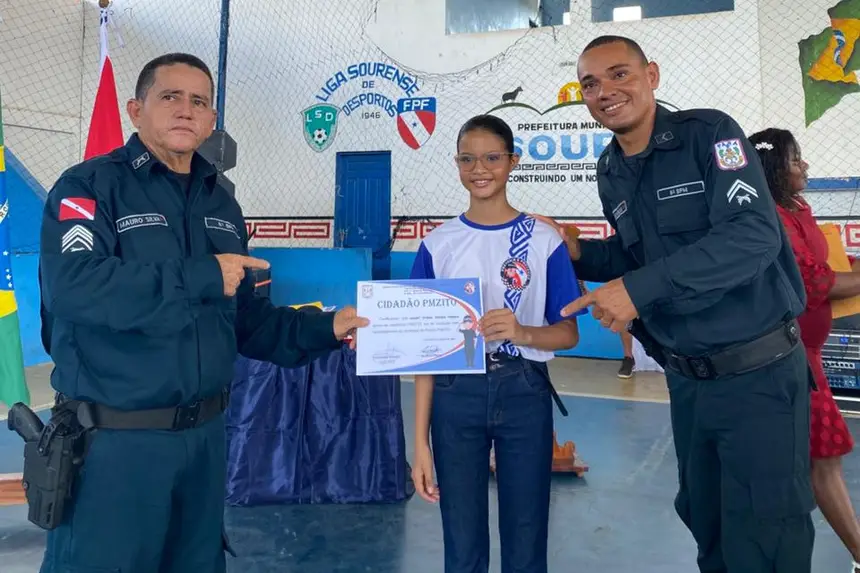 A Polícia Militar realizou a solenidade de formatura do ciclo 2025 do “Programa PMZito”, no Marajó Oriental, na sexta-feira (9), iniciativa da corporação desenvolvida na sede do 8º Batalhão (8° BPM), no município de Soure. Ao todo, 79 alunos dos currículos “criança” e “adolescente” foram diplomados como novos “Cidadãos PMZito", em uma cerimônia que contou com a participação de autoridades locais, familiares e membros da comunidade.