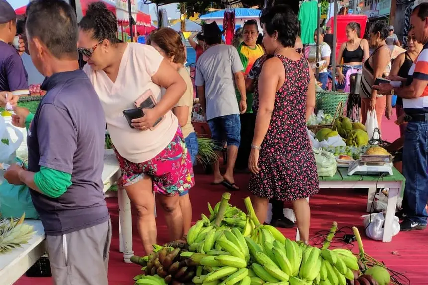Das 7h até o último cliente, na Praça da Igreja Nossa Senhora da Conceição, pelo menos 12 assentados da reforma agrária atendidos pela Emater em comunidades ribeirinhas comercializarão produtos como cupuaçu nativo, milho verde cru e biojoia de semente de açaí.