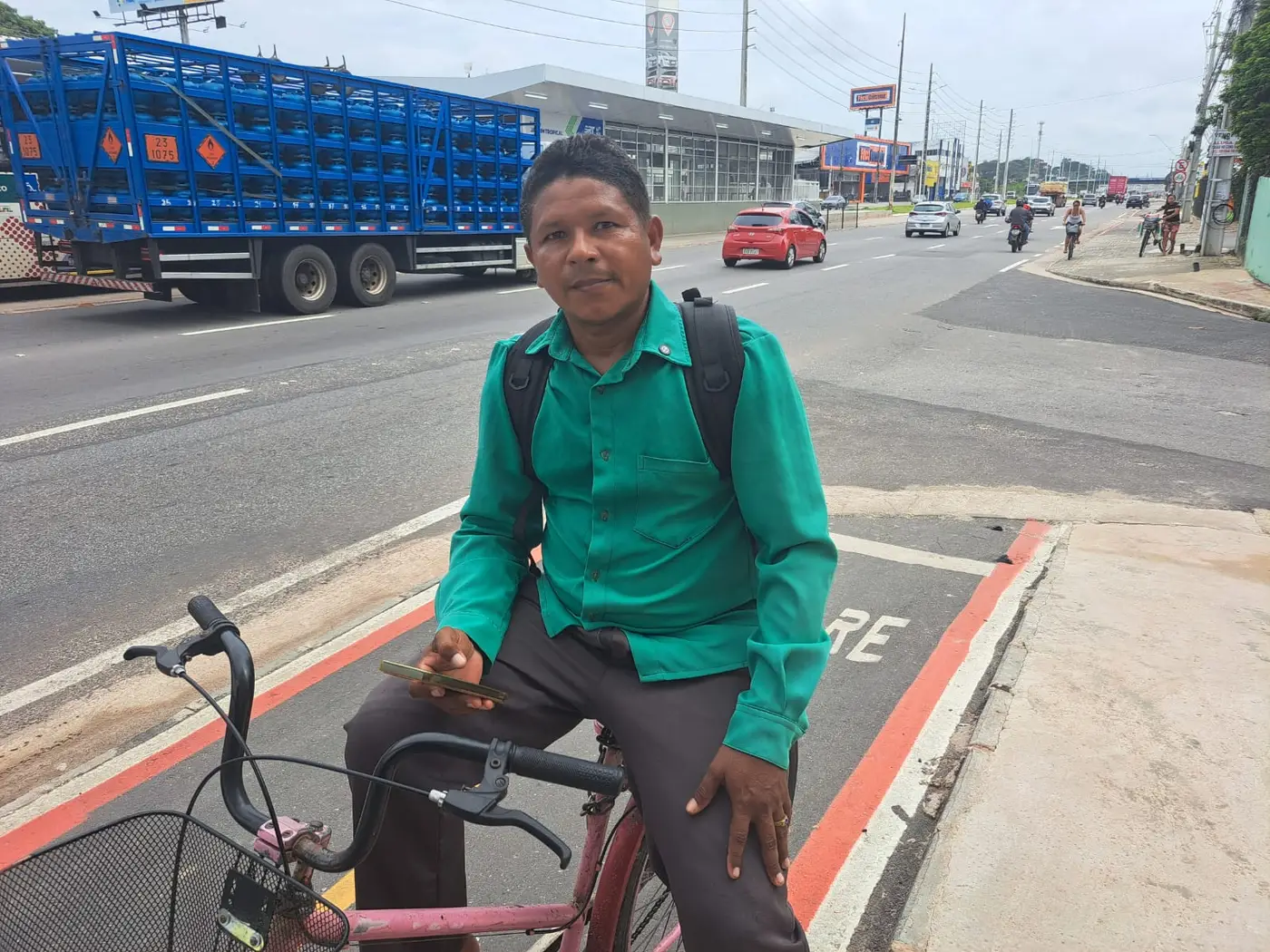O Genivaldo Moraes trabalha como entregador expresso há três anos e é pela BR-316, entre Marituba e Ananindeua, que ele transita de bicicleta todos os dias para conseguir o sustento da família. “Faço questão de usar a ciclofaixa porque o governo fez pra gente, para nossa segurança. Hoje, temos a nossa própria via, não faz sentido ter uma coisa tão boa dessa pra nossa vida e não respeitar. Falta mais consciência”, comenta.