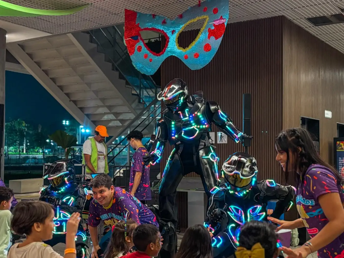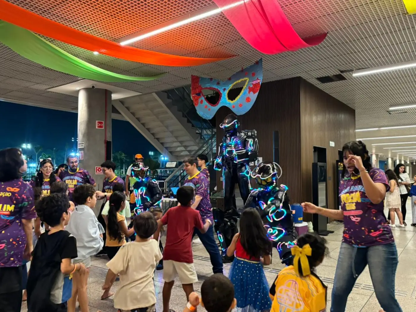 Oficinas criativas, bailinho e performances com robô gigante transformaram os espaços em pontos de encontro para pais e crianças, que aproveitaram o momento de folia