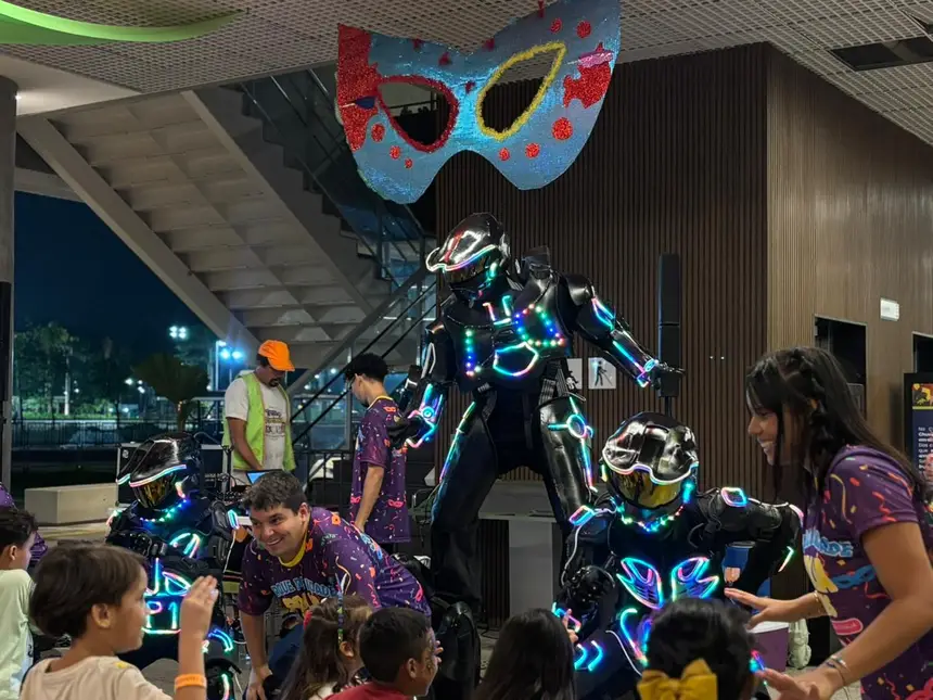 Neste domingo (8), o Parque da Cidade concentrou as atividades a partir de 17h, com oficinas e pintura facial, desde as primeiras horas. As apresentações da banda e as performances com robô gigante e dançarinos de LED chamaram a atenção das crianças e garantiram momentos de interação familiar.