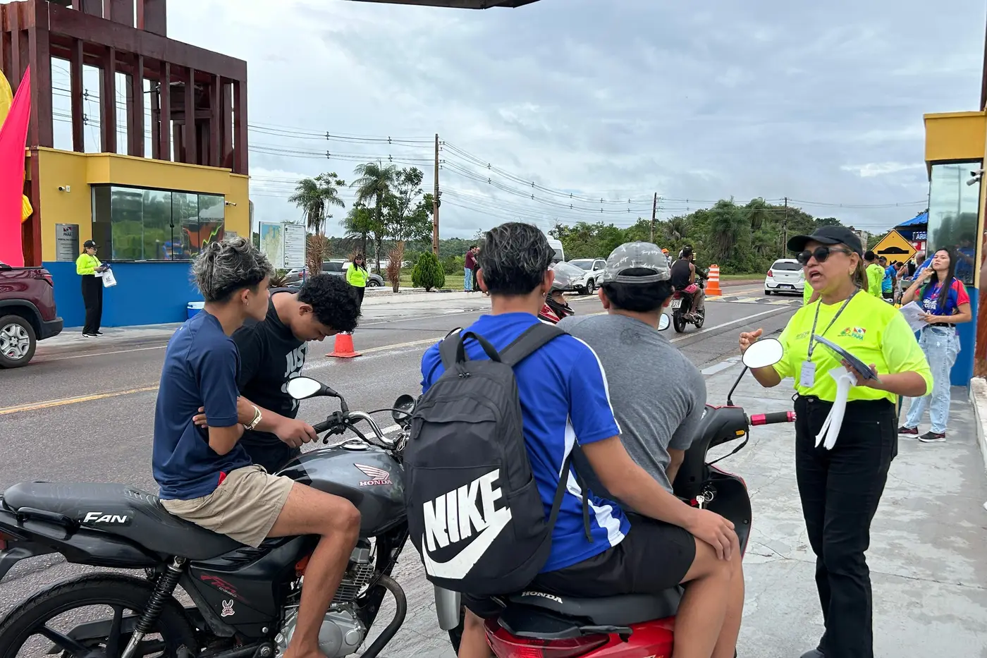 Em abordagens no pórtico de entrada, condutores são orientados sobre álcool e direção, uso do capacete e outros fatores de risco