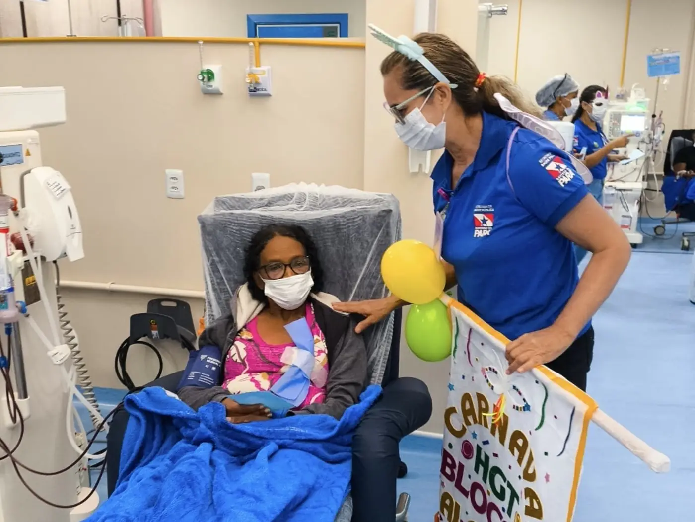 Aprovação - A paciente Maria Eunice da Luz Santos, de 64 anos, compartilhou sua emoção ao vivenciar o momento de alegria promovido pelo bloquinho no HGT. Em tratamento de hemodiálise há cerca de um ano na unidade, ela destacou o impacto positivo da iniciativa.
