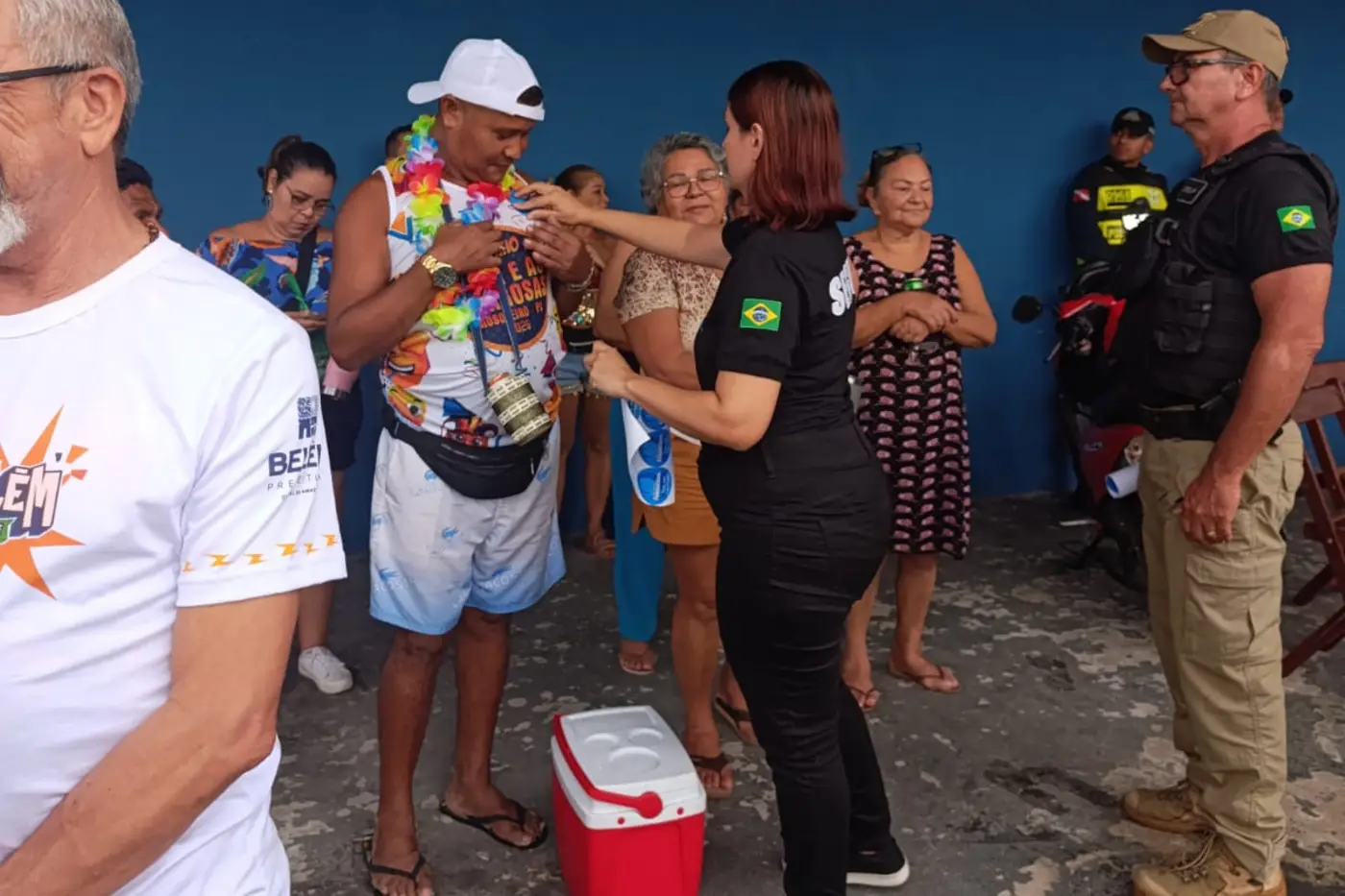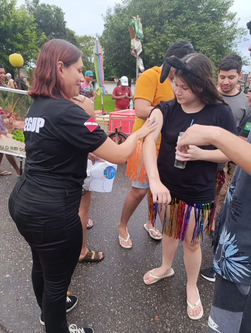 Ações educativas - Além das ações ostensivas, a Segup desenvolve atividades educativas por meio da Diretoria de Prevenção Social (DPS), com ações de sensibilização e distribuição de material informativo sobre prevenção ao feminicídio, à LGBTIfobia e à violência contra crianças e adolescentes. As atividades ocorreram na Praça da Vila, em pontos comerciais e junto aos brincantes do trio elétrico.