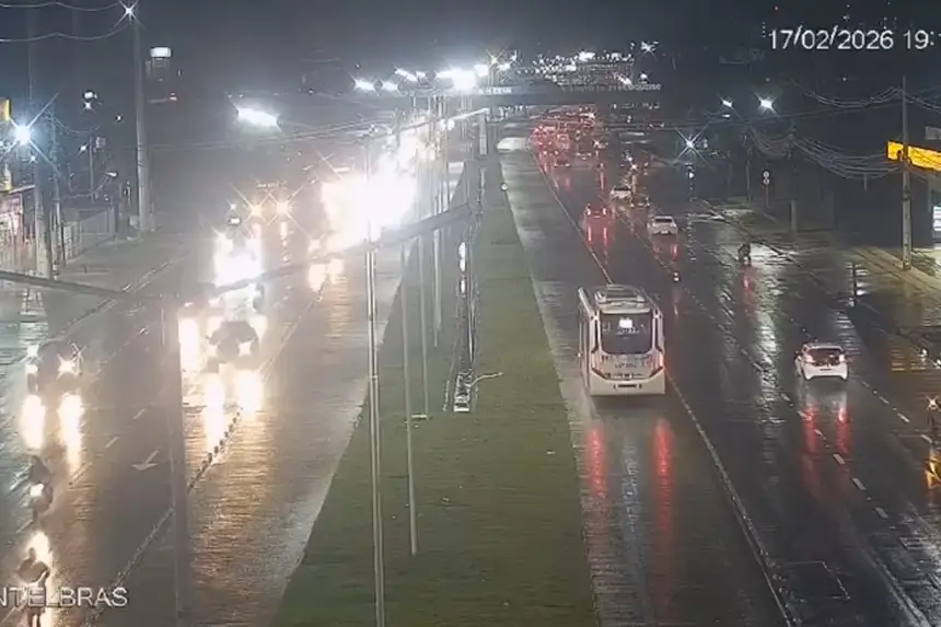 Apesar do grande fluxo de veículos e da chuva intensa, o tráfego na principal via de entrada e saída da capital estava fluindo no começo da noite de terça-feira