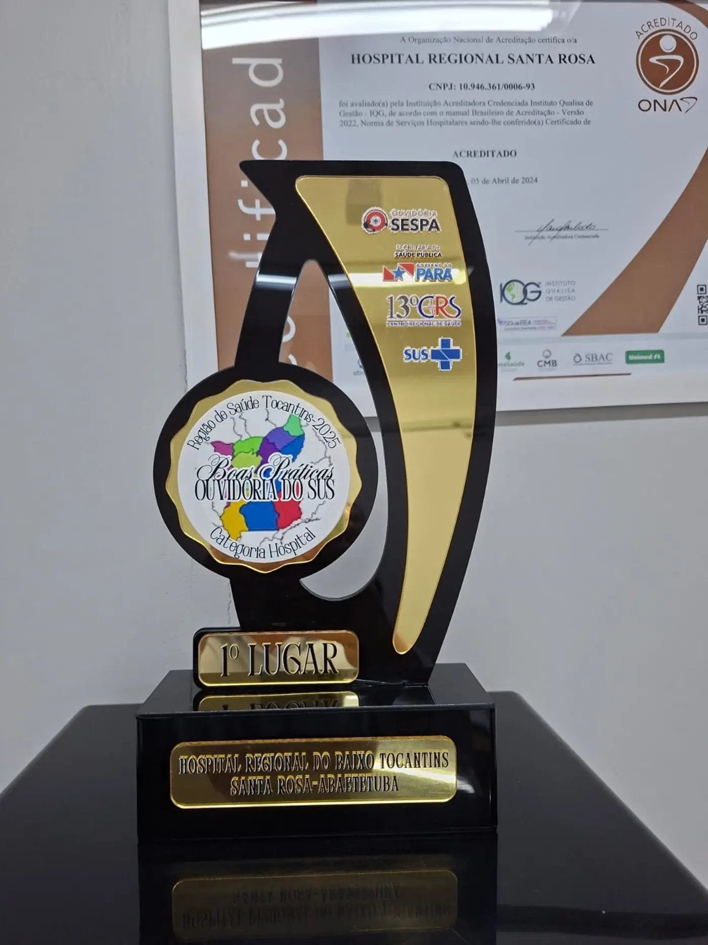 A entrega da premiação ocorreu na manhã desta quinta-feira (19), no 6º Centro Regional de Saúde Tocantins. O troféu referente ao 1º lugar foi entregue por Núbia Casais, Ouvidora SUS e Murilo Elder, Responsável Técnico pela Humanização. Isso foi feito em reconhecimento à boa prática desenvolvida em 2025 no âmbito da Ouvidoria do SUS no Hospital Regional do Baixo Tocantins Santa Rosa.