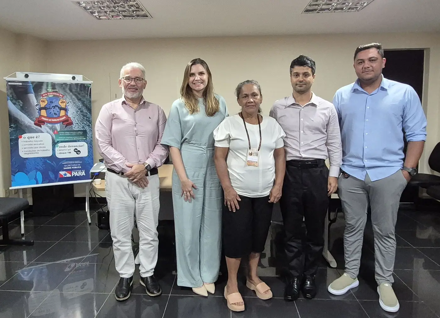 Da esq. para a dir.: Edgard Pereira Neto (Cerest Estadual), Carla Figueiredo (Sespa), Ana Carla Galvão (Sindicato das Empregadas Domésticas), Rafael de Castro (SRT) e Mauro Vilar (Divast)