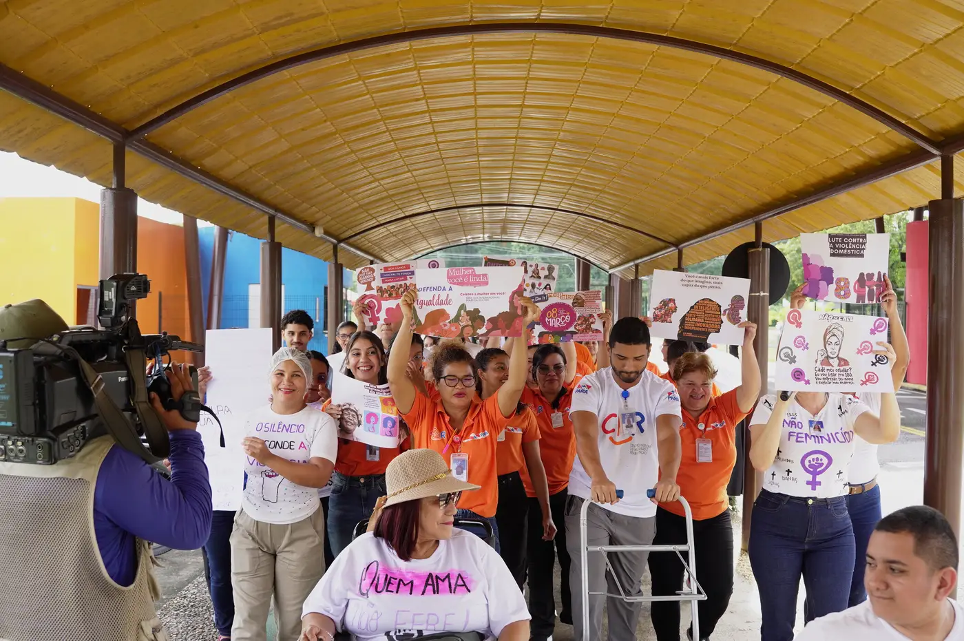 A abertura ocorreu com a “Marcha pelas Mulheres Vivas”, com concentração na portaria do CIIR. Os participantes compareceram ao ato levando cartazes produzidos na própria instituição, reforçando mensagens de enfrentamento à violência de gênero e valorização da vida das mulheres. A mobilização também contou com o convite para que todos vestissem as camisas customizadas na oficina “Não se cale”, fortalecendo o caráter simbólico da ação.