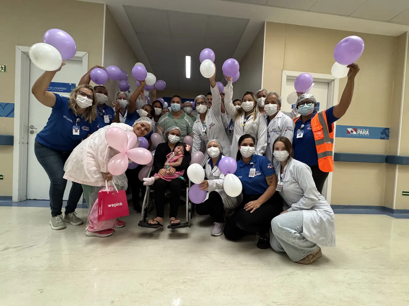 Para marcar o momento especial, profissionais do hospital formaram um corredor de despedida com balões coloridos, transformando a saída do hospital em celebração pela vida da paciente e pelo vínculo afetivo construído ao longo de jornada no PSRM.