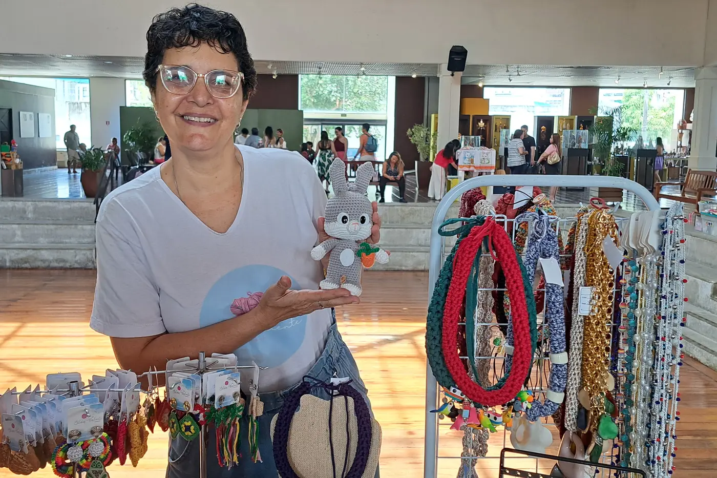 Silvia Valente participa do evento apresentando artes em crochê. No local, ela comercializa os tradicionais amigurumis, além de colar e brincos produzidos com a técnica de microcrochê. Ela conta que trabalha há oito anos com essa arte e avalia como fundamental o apoio do governo na disponibilização do espaço, especialmente para quem não possui um local físico.
