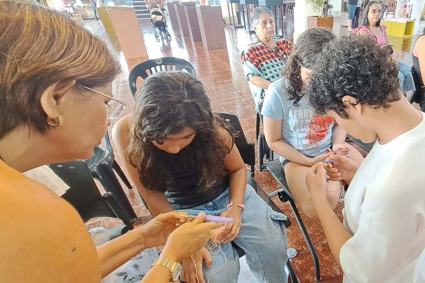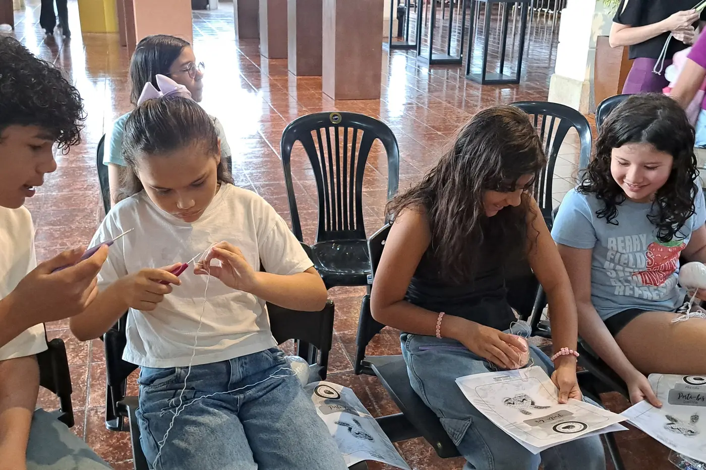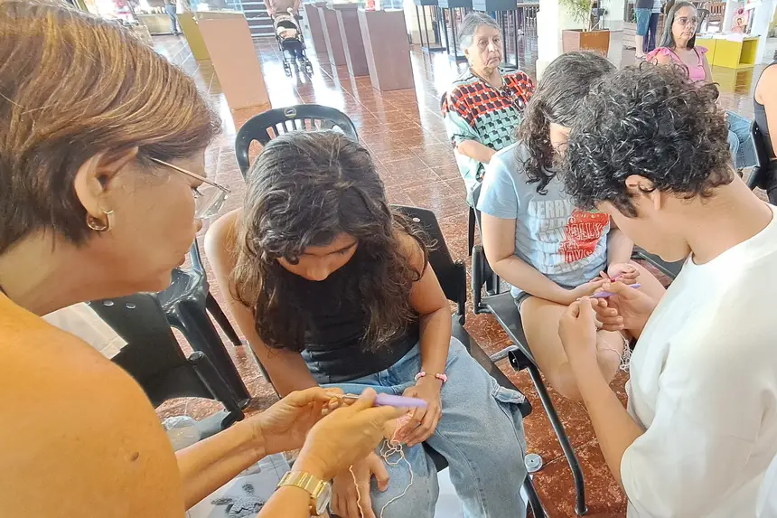 Patrícia Melo, 52 anos, levou a neta, Valentina Melo, de 9 anos, para participar da oficina de crochê. Ela conta que pratica a técnica há muitos anos e já havia ensinado a neta, embora sem a didática adequada. “Valentina sempre demonstrou interesse pelo crochê. Está sendo gratificante vê-la dando os primeiros passos nessa arte, que certamente contribuirá para o seu desenvolvimento.”