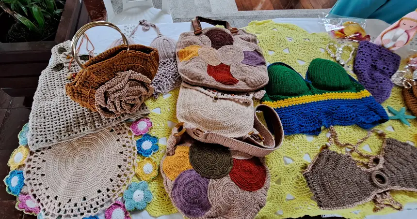 Feito à mão - As irmãs Jane e Jaciara Mesquita participaram pela primeira vez da exposição no Espaço São José Liberto. Elas trabalham com crochê, produzindo bolsas, roupas e chapéus, que valorizam o produto feito à mão e a identidade artesanal.